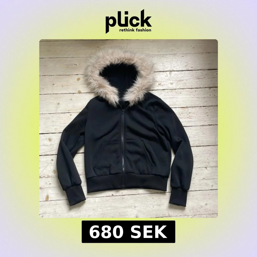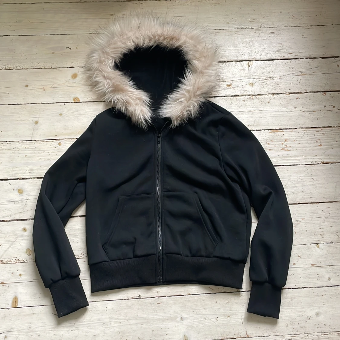 Svart bomberjacka med dragkedja och huva kantad med ljus fuskpäls. Jackan har långa ärmar, ribbade muddar och två fickor framtill. Perfekt för kyligare dagar.