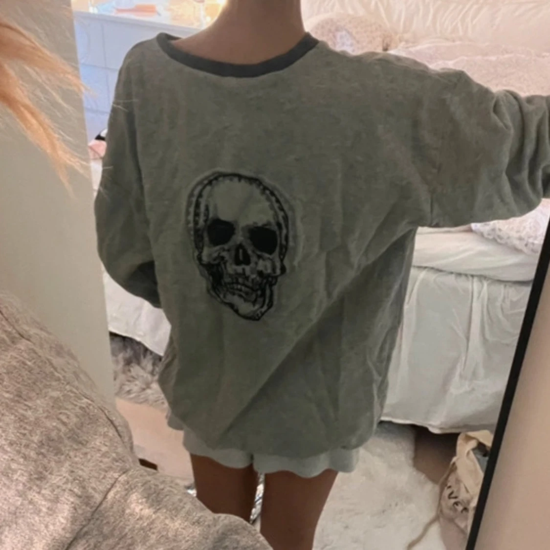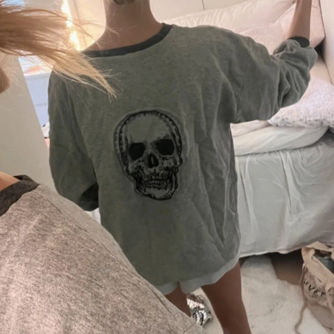 Ljusgrå sweatshirt med mörkgrå muddar och döskalle tryck på ryggen
