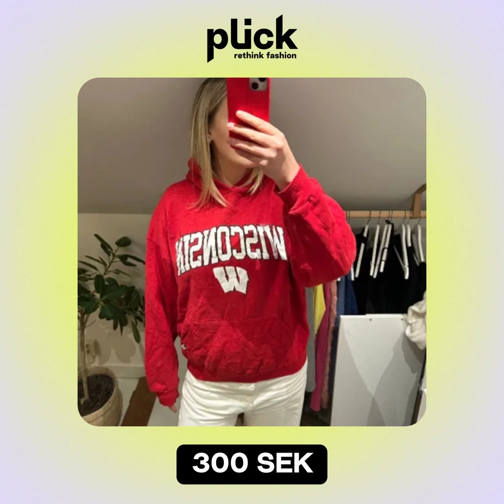 Röd vintage Wisconsin hoodie i strl M. Väldigt fint skick förutom en liten defekt på trycket (bild 3)! Jag säljer just nu över 15 tröjor så kolla i min profil för fler, pm för frågor!!