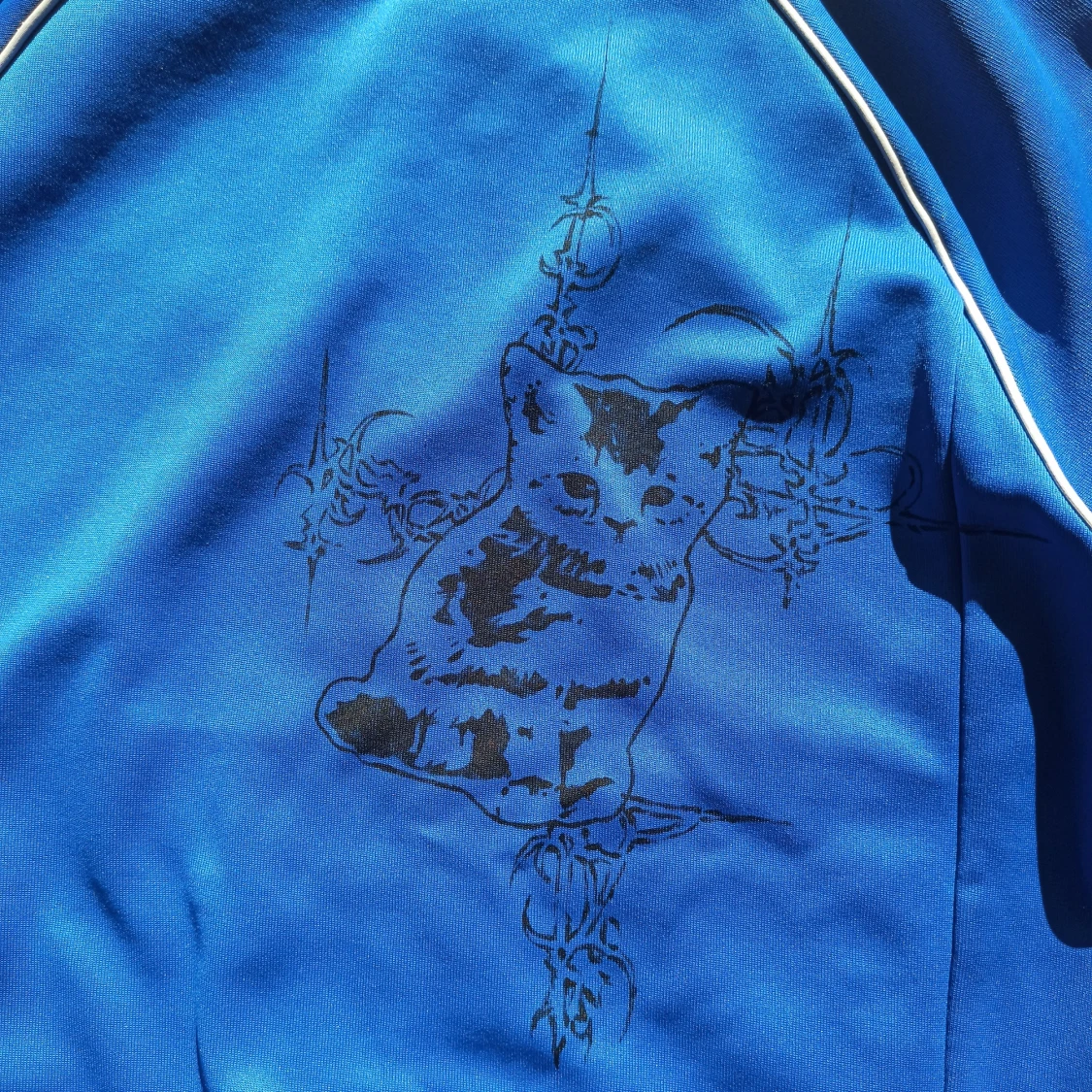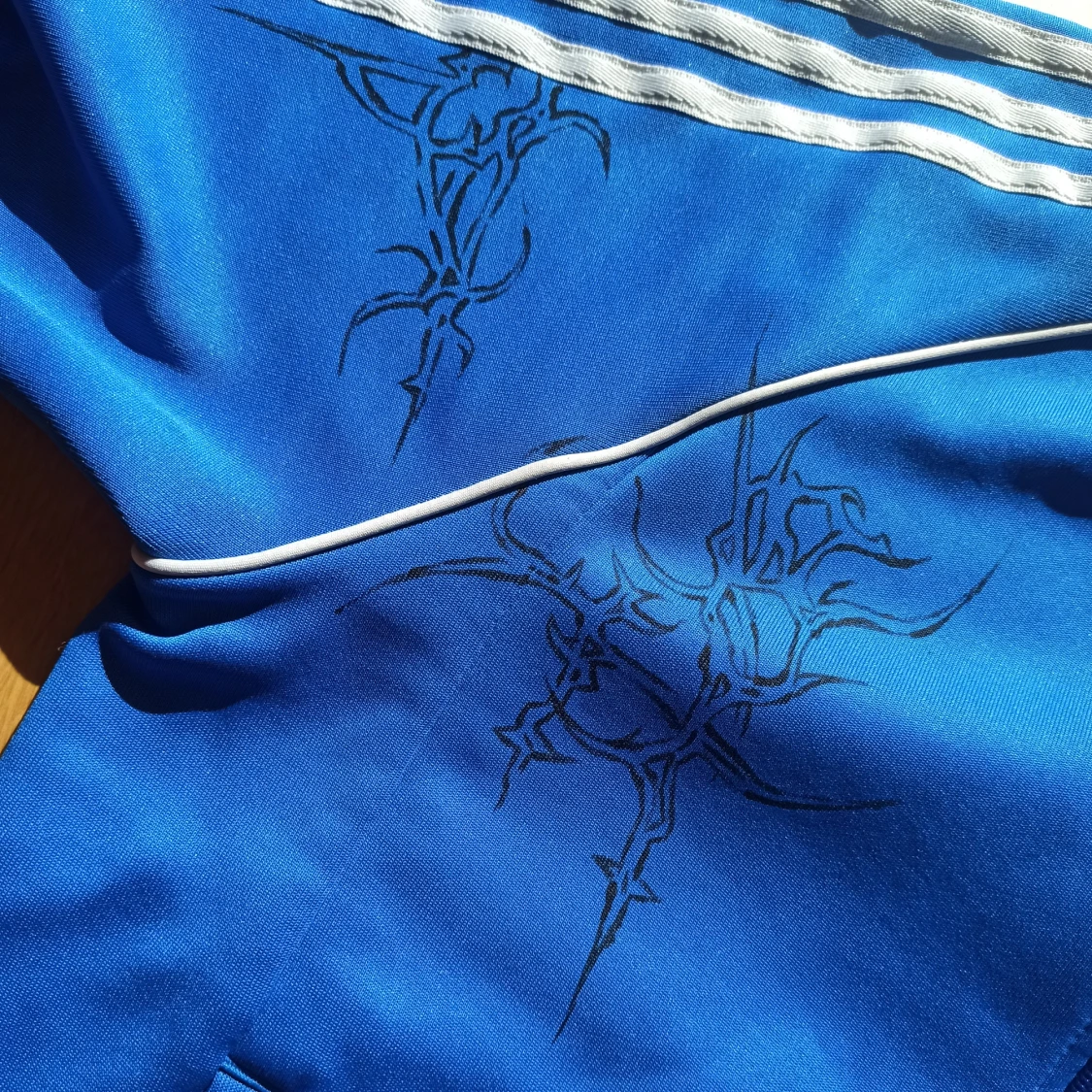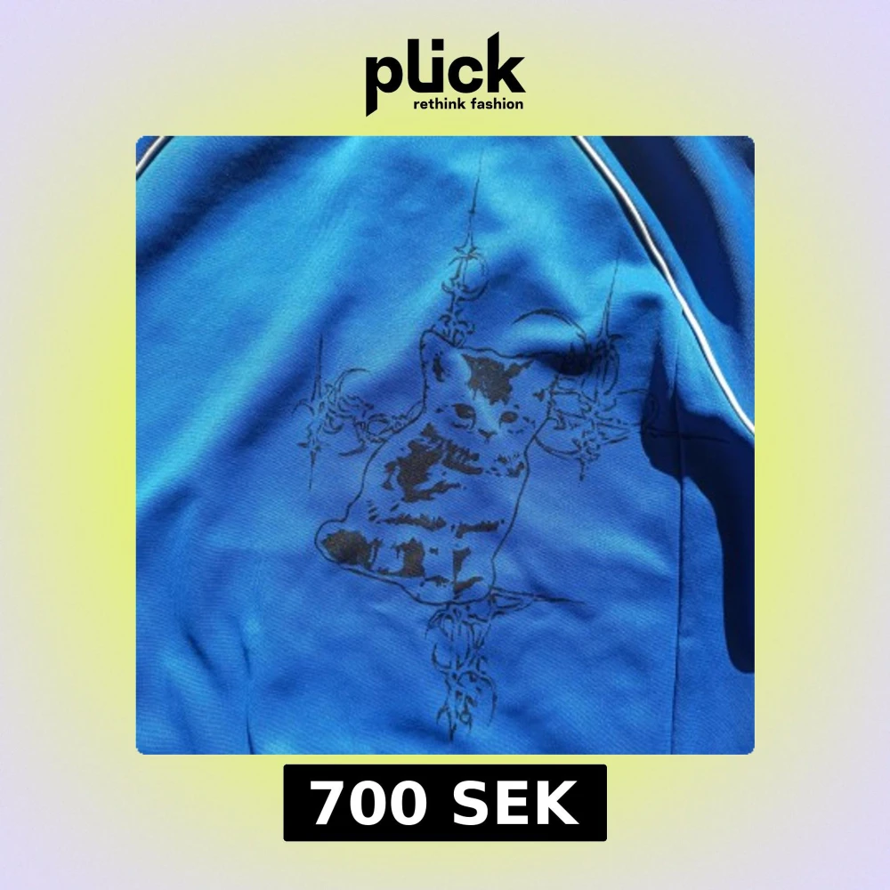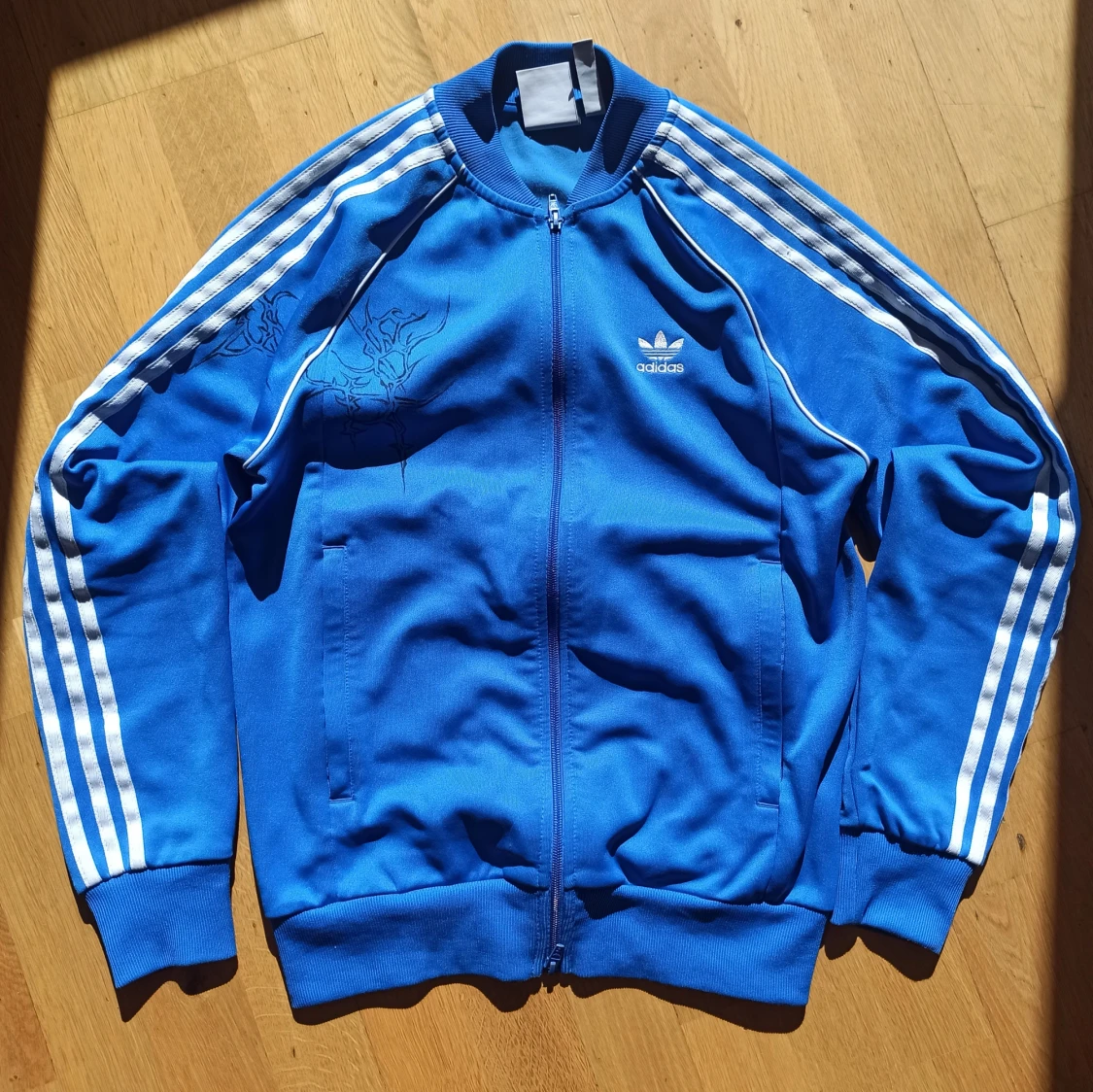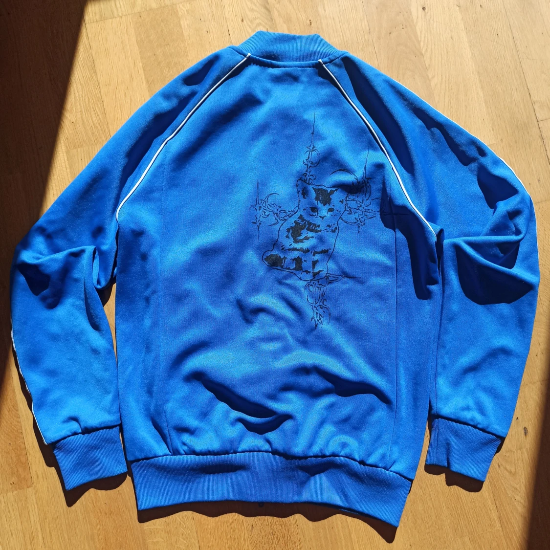 Blå Adidas zip hoodie med vita ränder på ärmarna och dragkedja framtill. Unik svart tribal-inspirerad design och stor kattillustration på ryggen. Hoodie har ribbade muddar, ståkrage och är tillverkad i polyester. Perfekt för dig som vill sticka ut med streetwear-vibe. Mer information, bilder och prisdiskutering i dm. Äkta adidas. Unic peace