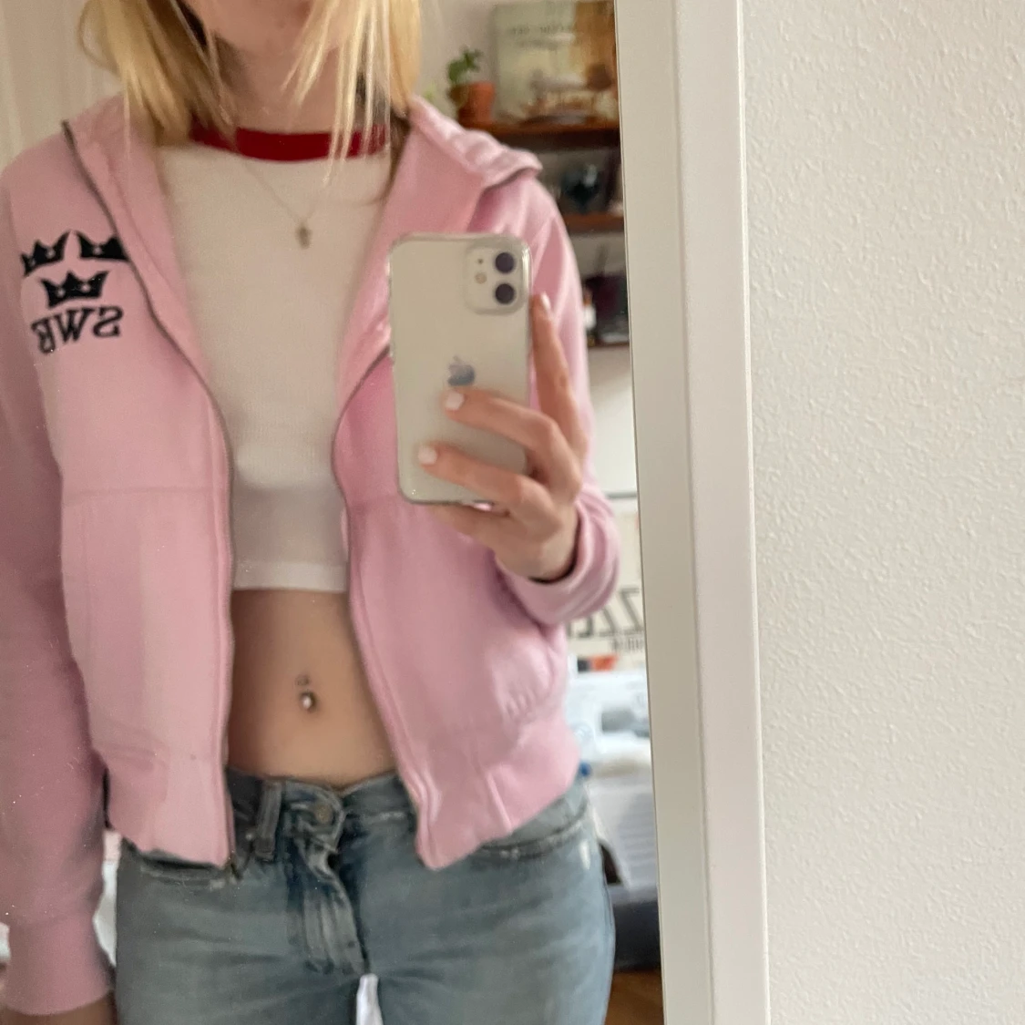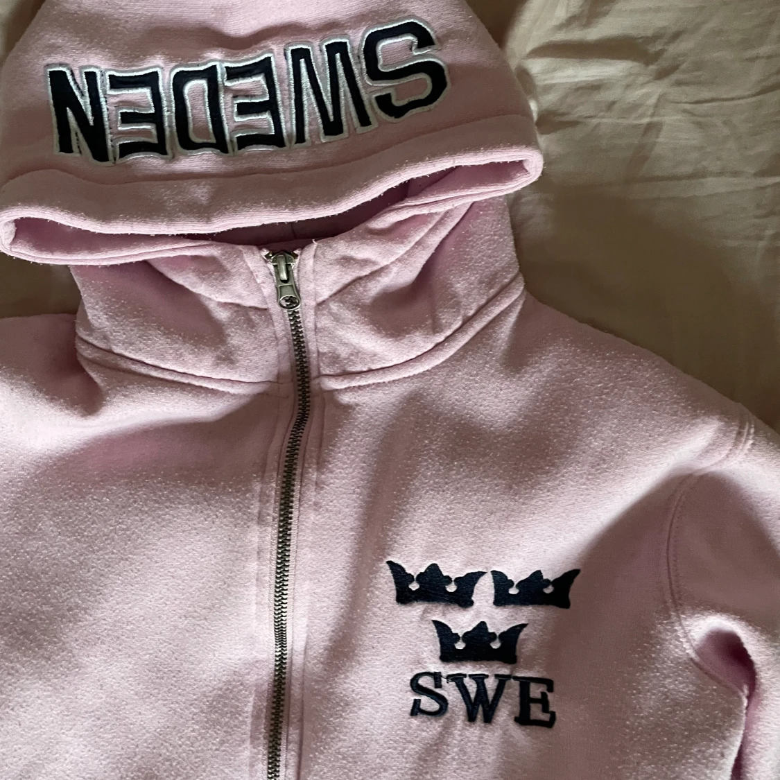 Ljusrosa zip up hoodie med texten SWE och tre kronor, står också sweden upp och ned på luvan. Köpte second hand, den är använd och lite nopprig men väldigt skön. Kan mötas i Stockholm annars betalar köpare frakt.