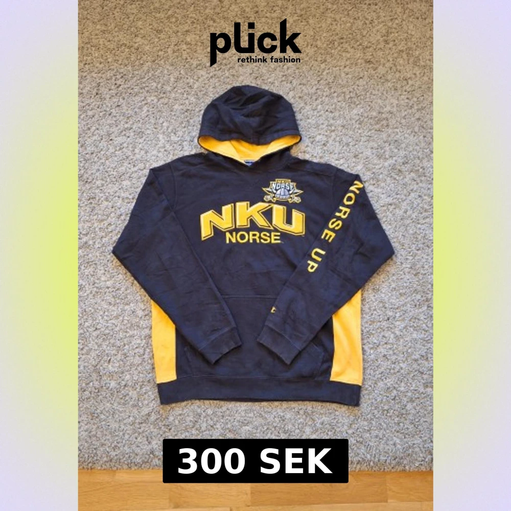 Snygg NKU Norse hoodie från Champion i storlek L, men skulle nog säga den passar mer som M. Använd fåtal gånger och skicket är i princip som ny, inga slitningar eller defekter finns. Den har en Champion logga på vänstra ärmen samt en text på samma ärm. Passar riktigt bra för dig som vill ha en lite mer chill dag. Skick: 9/10