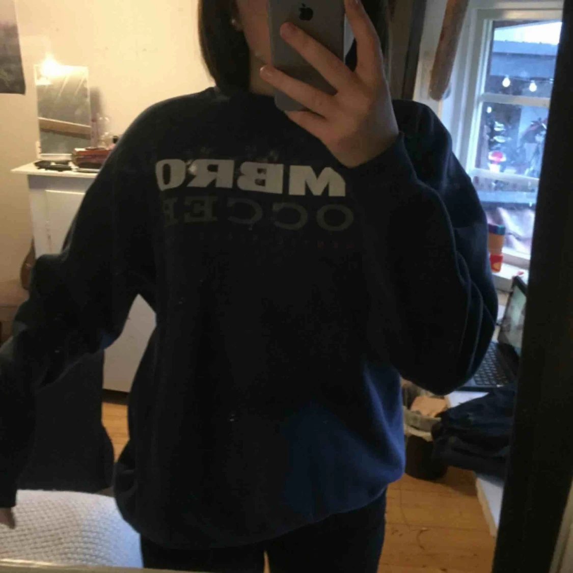 Stor mörkblå sweatshirt. I andvänt skick och ganska sliten i ena ärmen