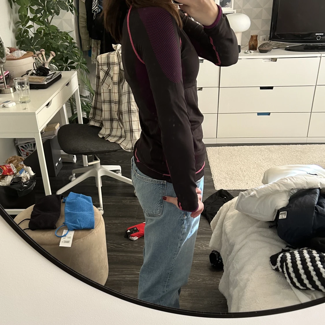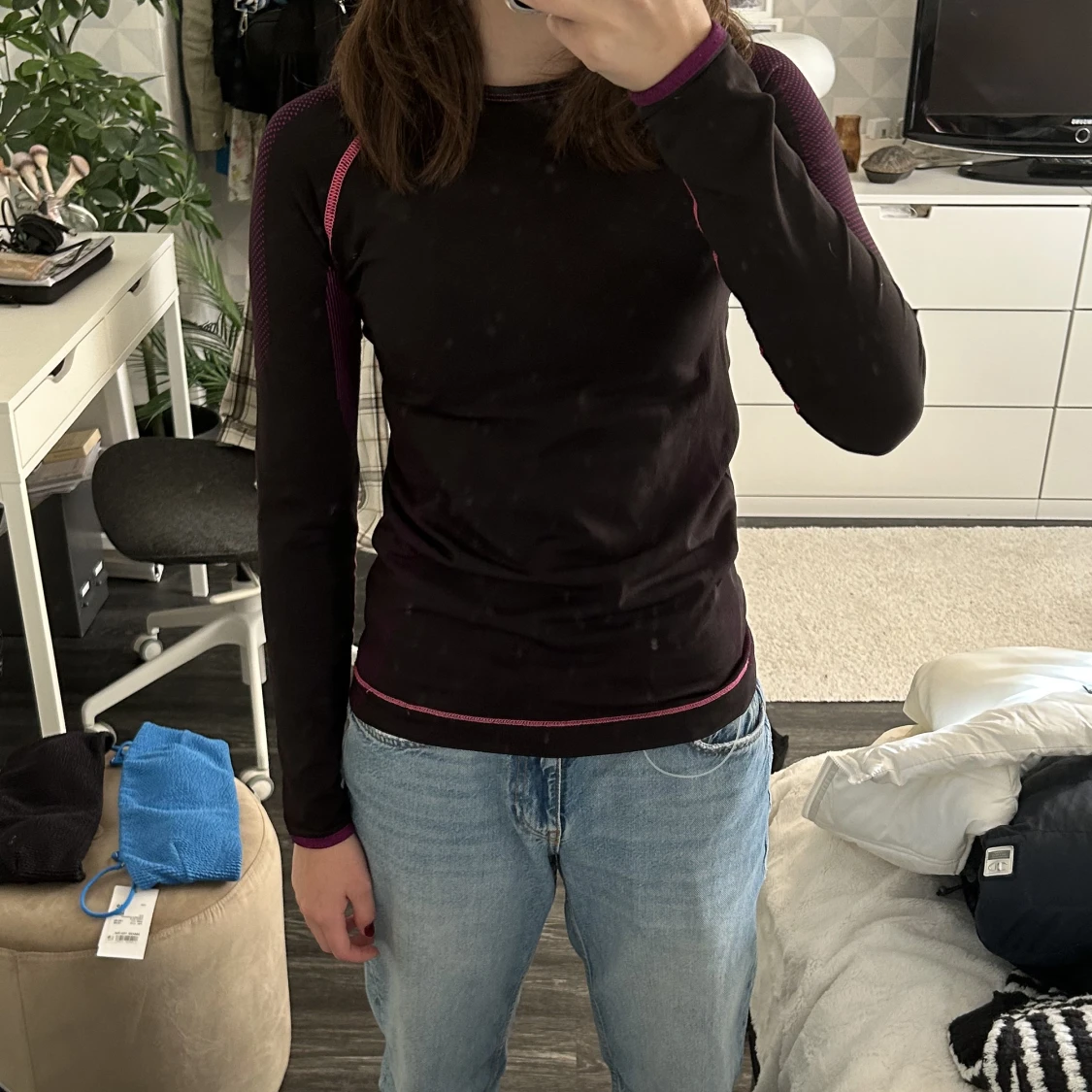 Jag säljer en svart underställs tröja med lila och rosa detaljer och sömmar, tröjan är från h&m i storlek 158/164. Den är i hyfsat bra skick.