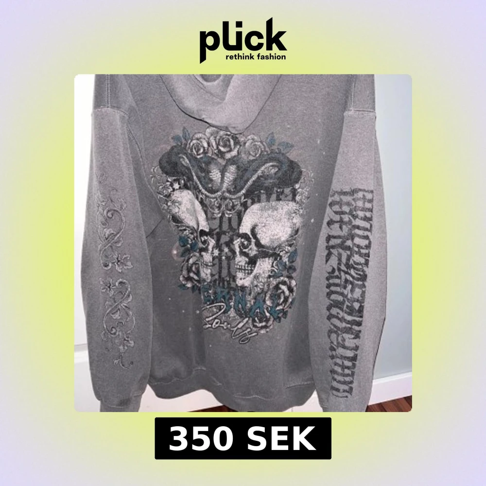 Säljer en grå hoodie från Urban Outfitters med coolt tryck av dödskallar och rosor på ryggen. Ärmarna har snygga broderade detaljer och text. Perfekt för en avslappnad stil.