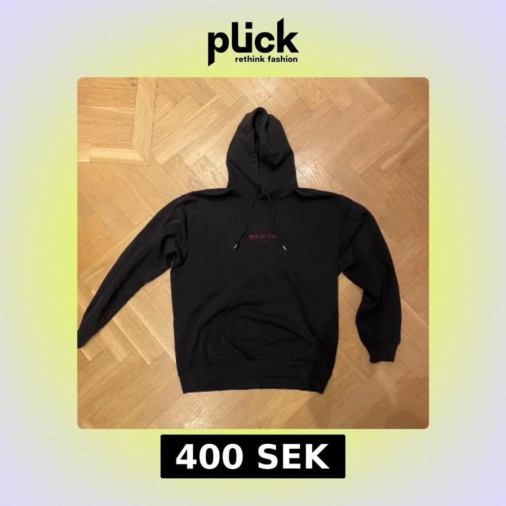 Svart limited hoodie från Vailent (köpt på Carlings) med röd broderad text 'SEE NO EVIL' på bröstet och stort tryck med fladdermus och text på ryggen. Hoodien har snörning i huvan, känguruficka och långa ärmar. Perfekt för dig som gillar streetwear med coola detaljer. Använd men i bra skick.