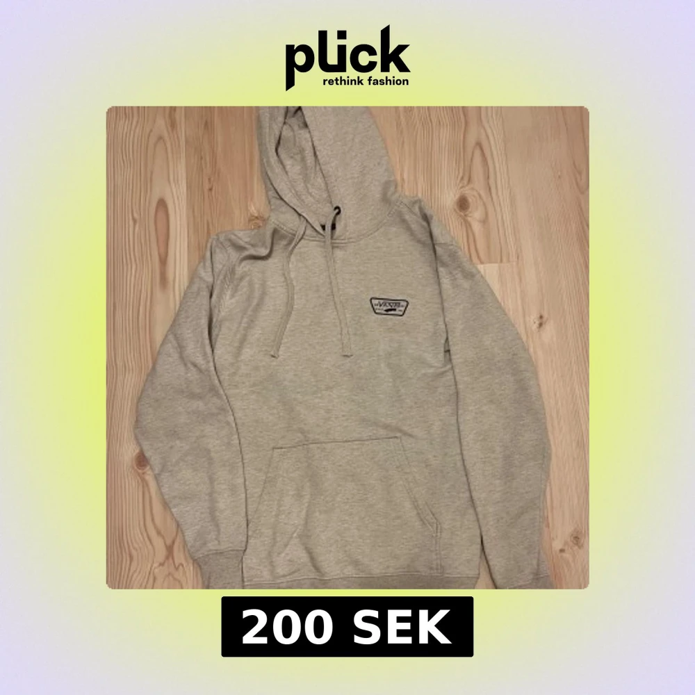 Säljer en ljusgrå hoodie från Vans med logga på bröstet och stor logga på ryggen. Tröjan har huva med dragsko och en stor magficka. Perfekt för en avslappnad stil.