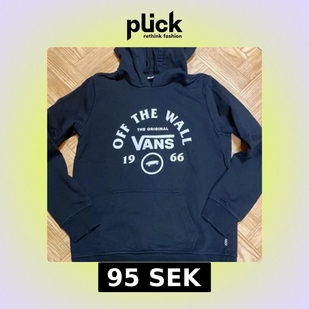 Säljer en svart hoodie från Vans med trycket 'Off The Wall' och årtalet 1966 i vitt. Tröjan har en klassisk känguruficka och ribbade muddar vid ärmslut och nederkant. Perfekt för en avslappnad stil. Hoodien är sparsamt använd