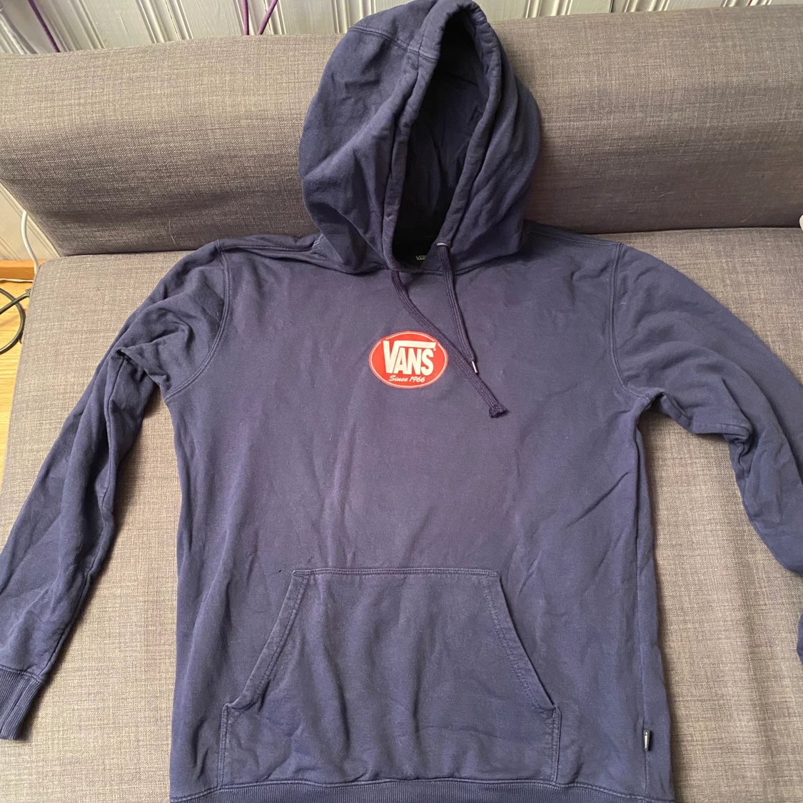 Säljer min marinblåa Vans hoodie då den knappt använd, hade behövt sig en strykning samt så finns det ett litet hål ovanför fickan se bild. Bortsett från det en fin märkeshoodie. Nypris 749:-