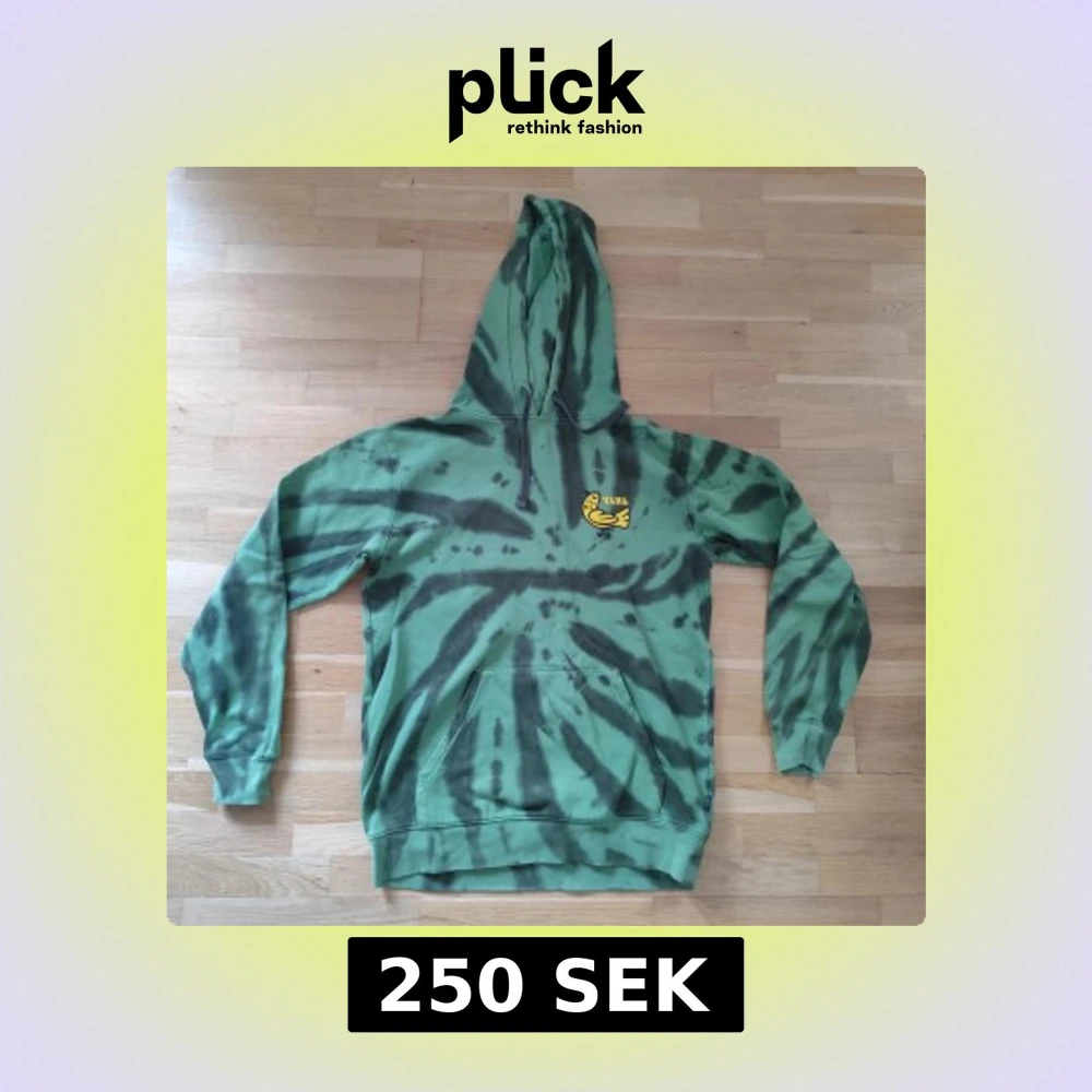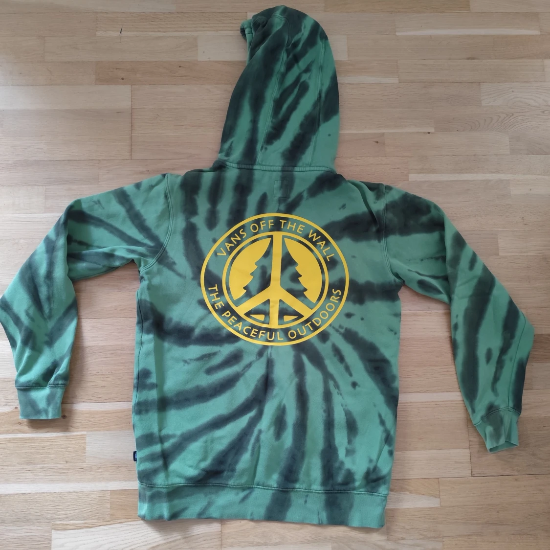 Säljer en grön och svart tie-dye hoodie från Vans med stor gul peace-logga och texten 'Vans Off The Wall The Peaceful Outdoors' på ryggen. Framtill finns en mindre logga och klassisk känguruficka. Perfekt för dig som gillar streetwear och coola mönster.