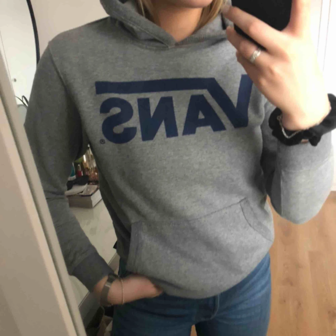 Grå Vans hoodie med mörkblå logga, är i storleken M men passar mer s-xs! Relativt tunt material som fortfarande är mjukt!