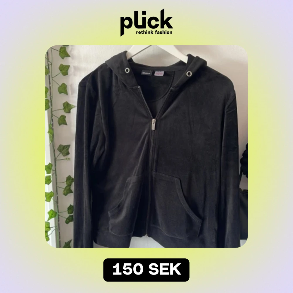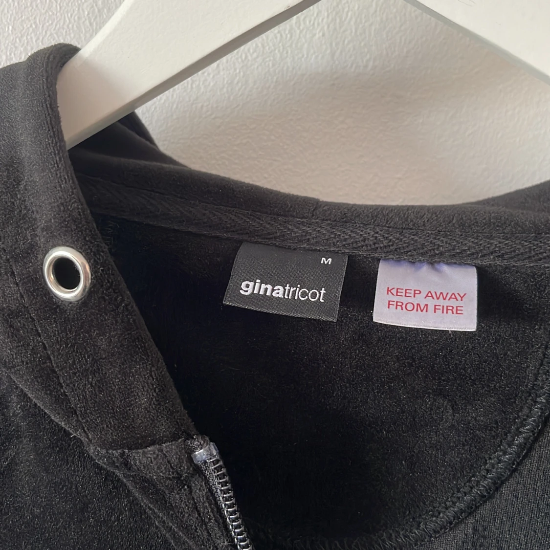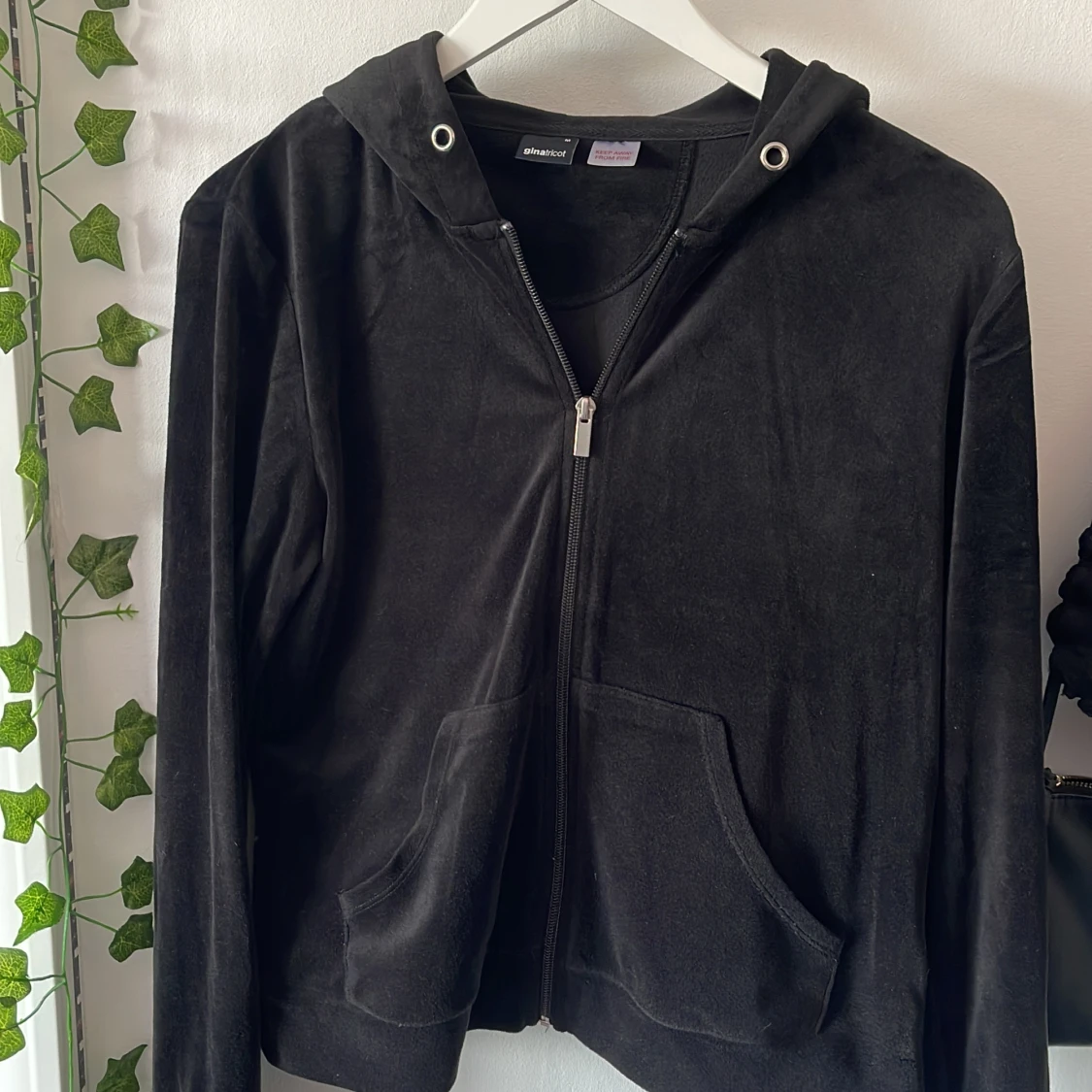 Svart velour tröja med dragkedja från ginatricot i stl M, snöret till luvan saknas men annars ser den orörd ut🙌🏻