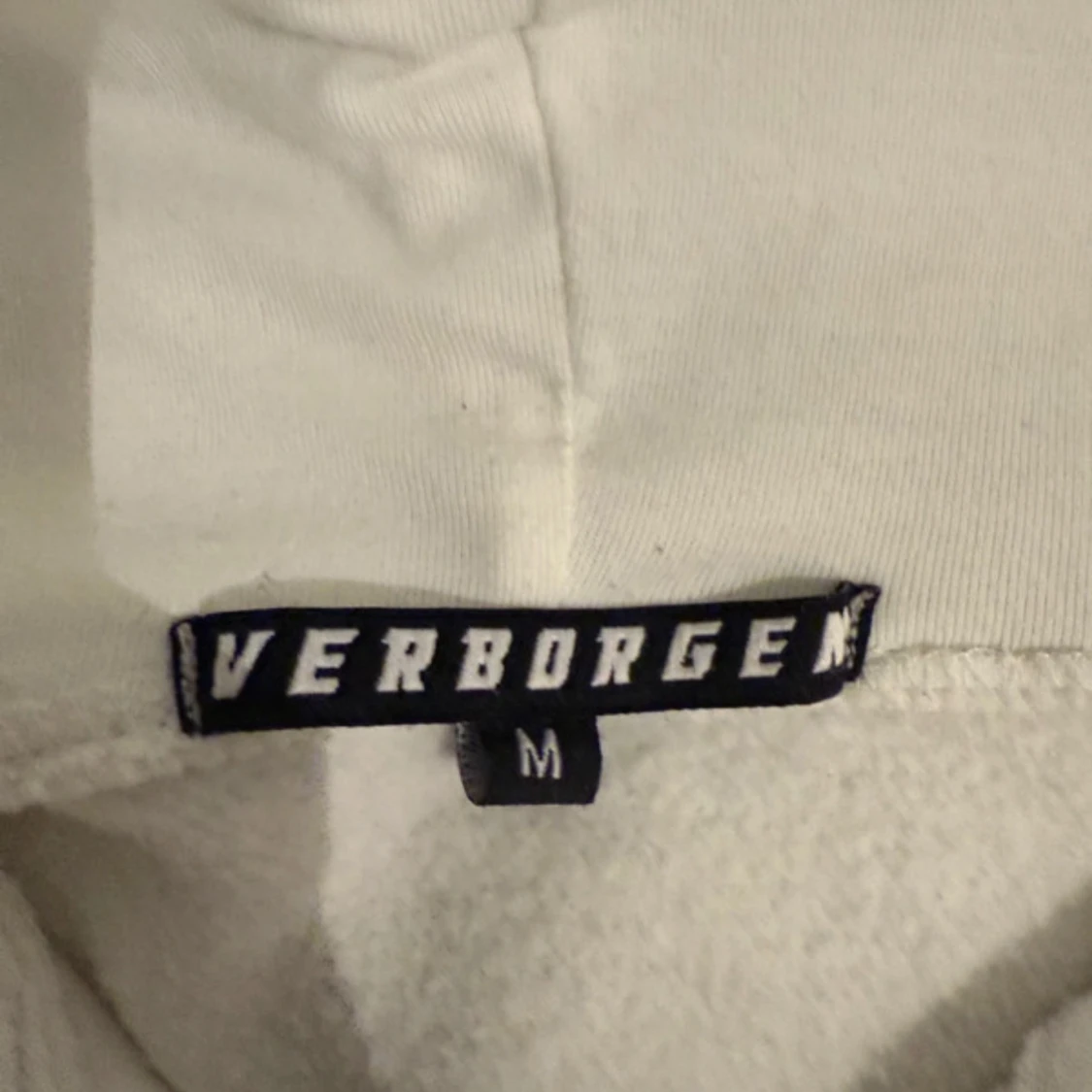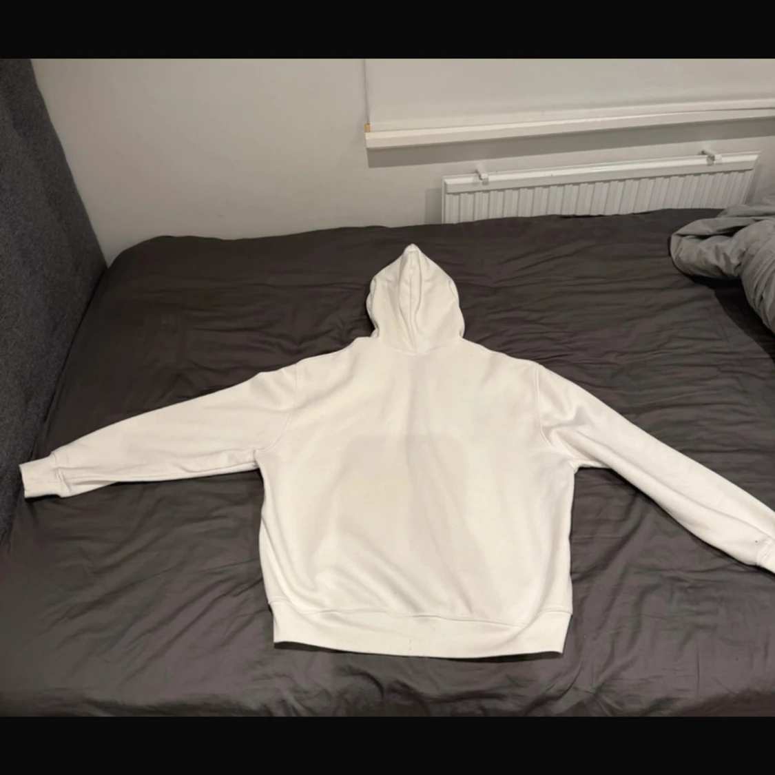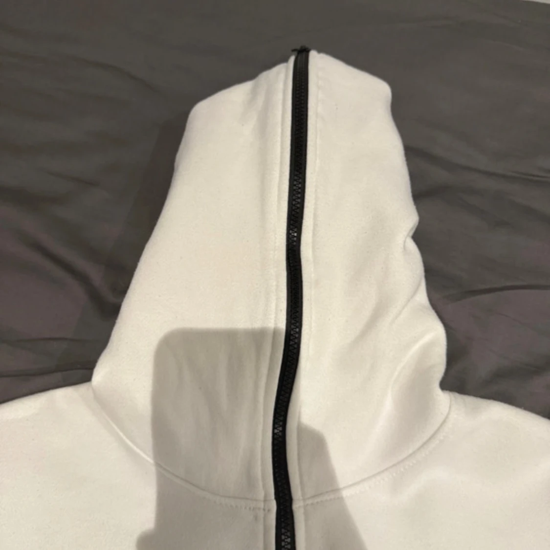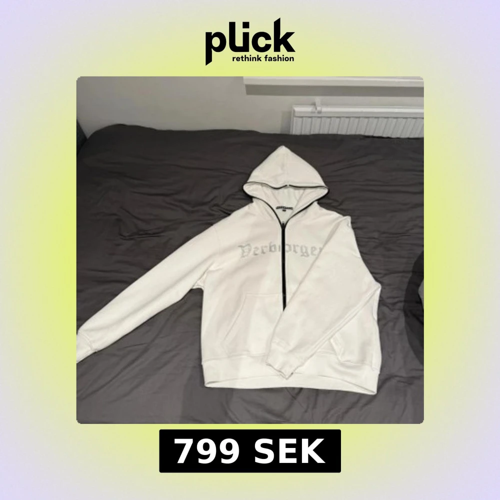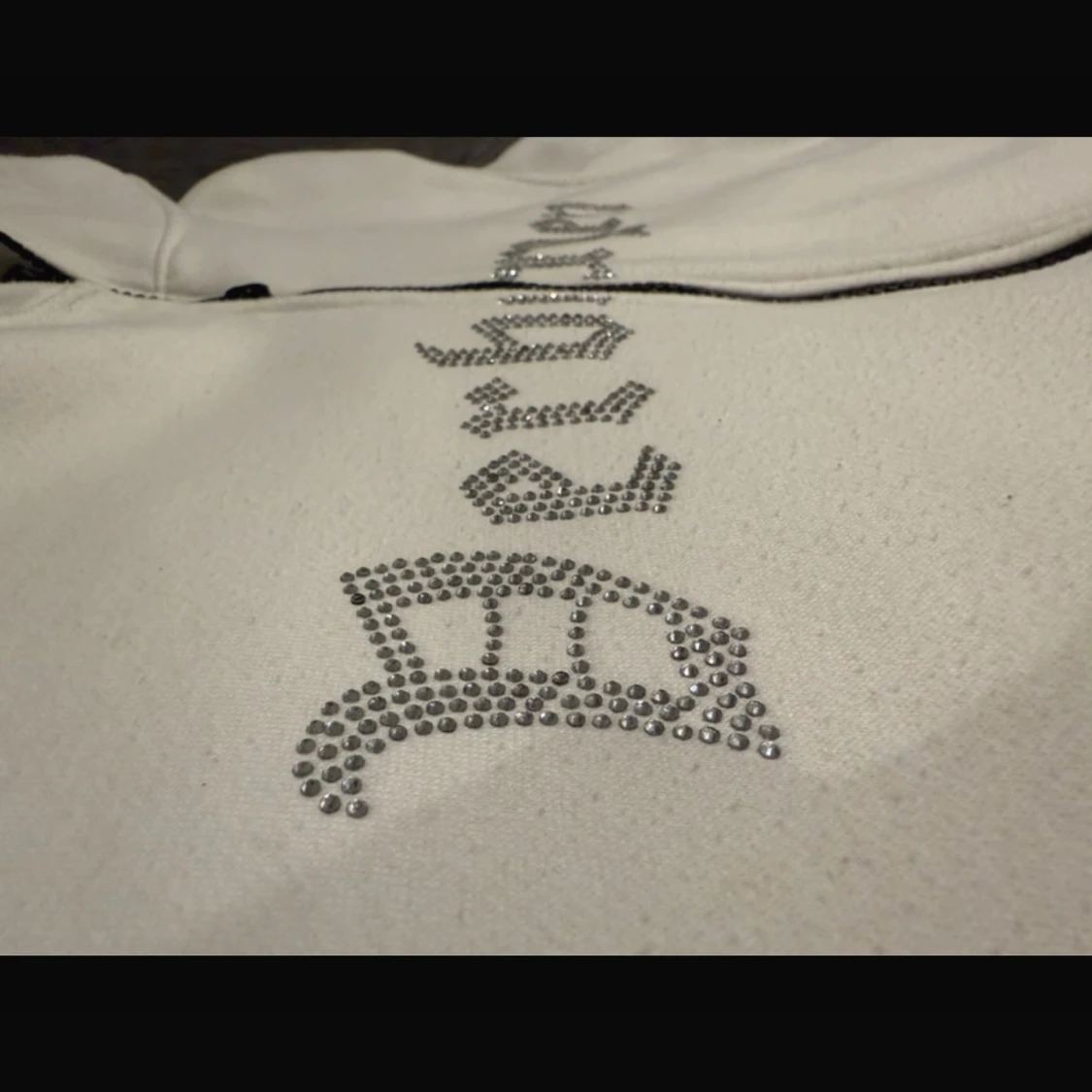 Denna vita hoodien i storlek M har en unik design med rhinestones och en dragkedja som går ända upp till toppen av luvan, materialet på hoodien är bomull och polyester. Ny pris på tröjan är 1300kr.