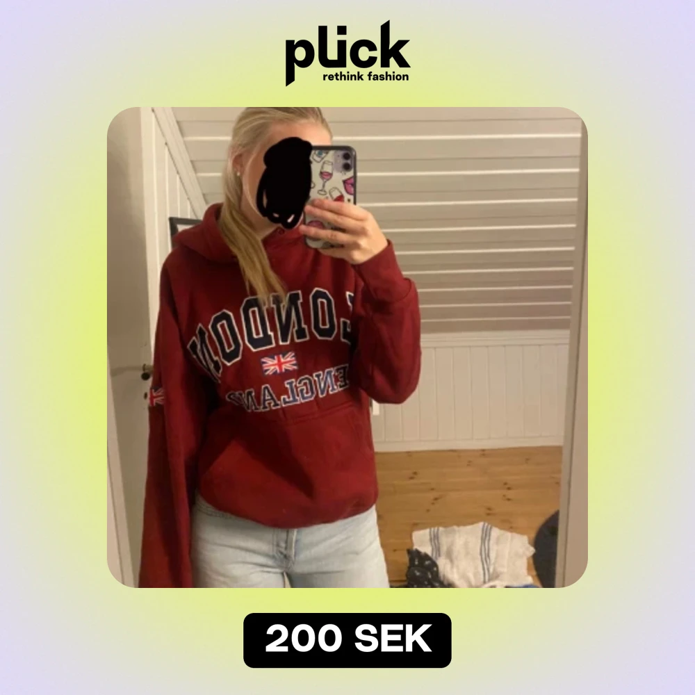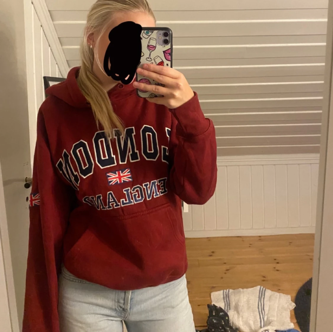 vinröd hoodie med london tryck. köpt secondhand men aldrig använd av mig.
