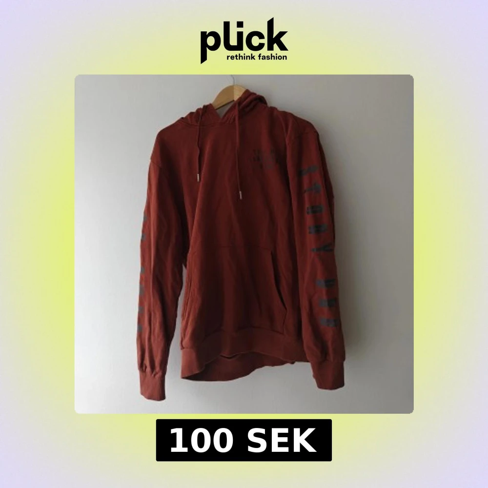 Vinröd hoodie med svart tryck på bröstet där det står 'Tell me something new' och grafiska detaljer längs ärmarna, tror det står samma där. Tröjan har huva med snörning och en stor magficka. Kan mötas i centrala Stockholm eller Huddinge.