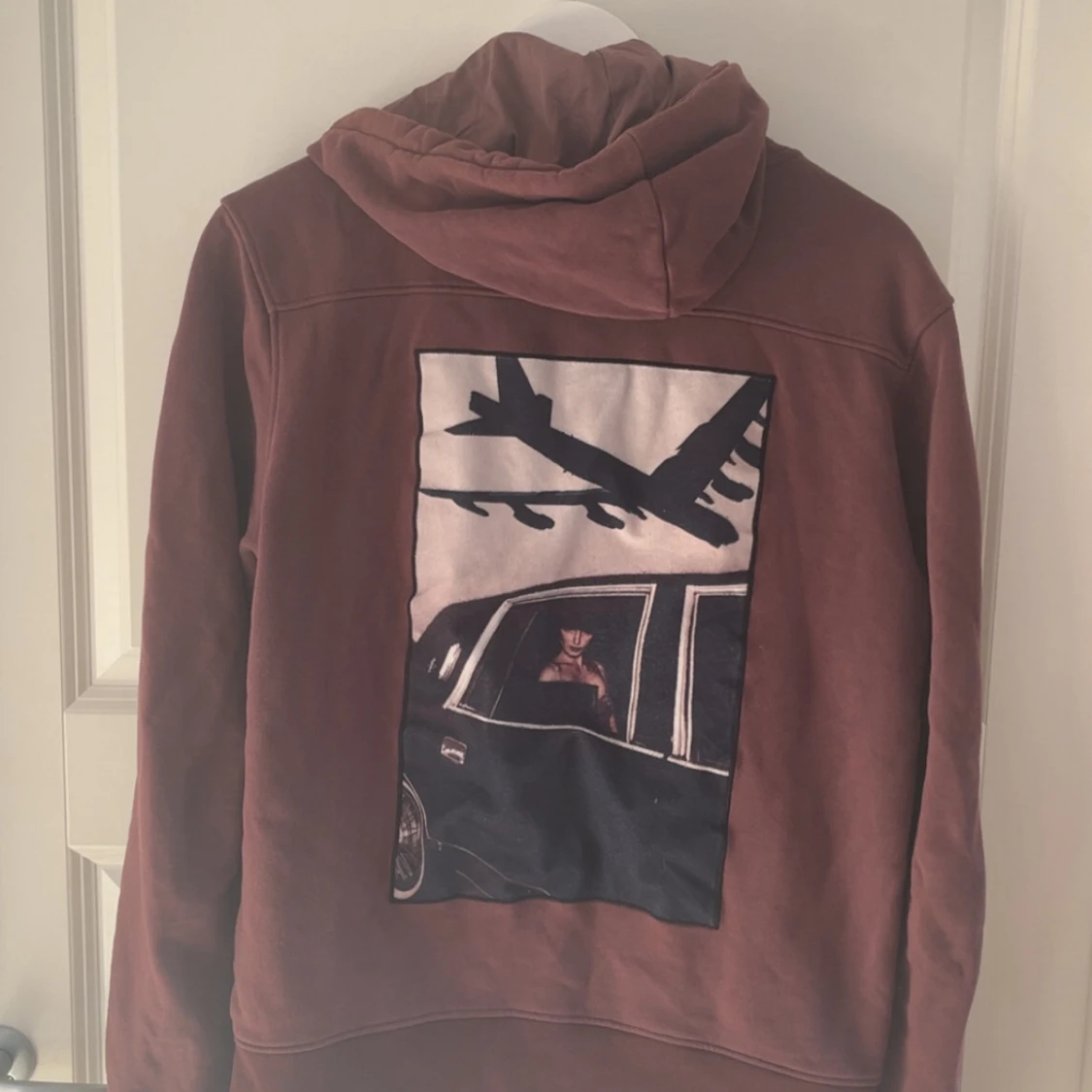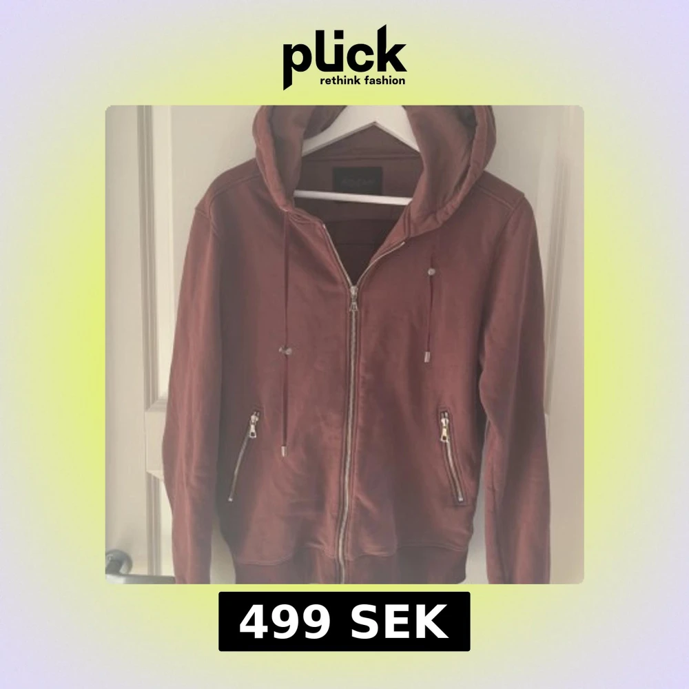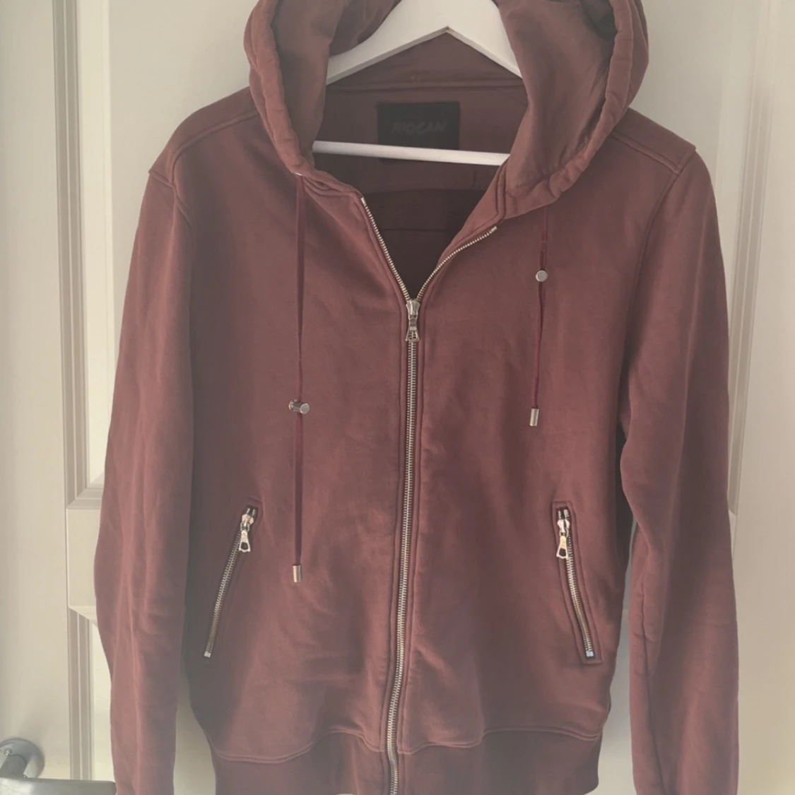 Säljer en vinröd hoodiejacka från Limitato x Riocam med dragkedja framtill, snörning i huvan och två fickor med dragkedja. Baksidan har en stor grafisk patch med motiv. Jackan är i mjuk bomull och har en avslappnad passform.