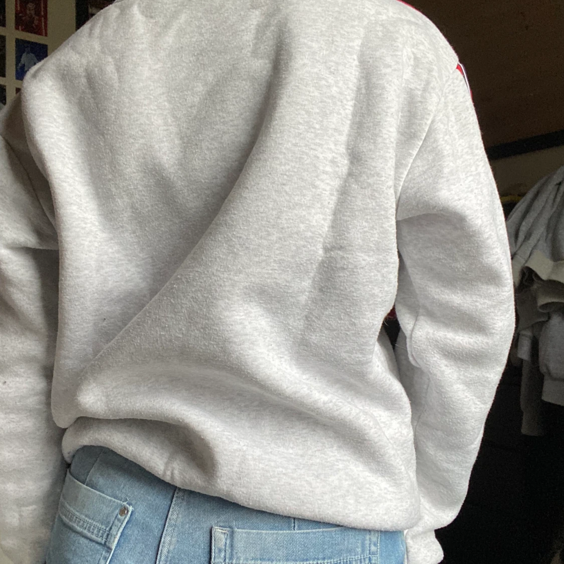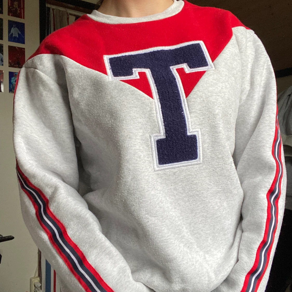 Grå sweatshirt med röda, vita och mörkblåa detaljer. Storlek S/36/38. Oversized.