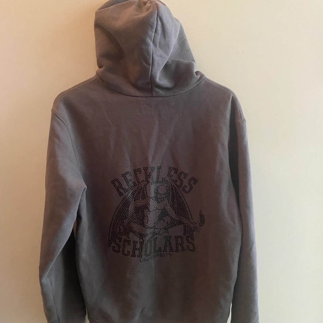Måste tyvärr göra mig av med min favorit hoodie som fått mycket användning men blivit för liten. Inga rhinestones fattas men några har blivit skavda på. Annars är hoodien i riktigt fint skick. Galen färg, tryck och passform. Tveka inte att höra av dig vid funderingar!