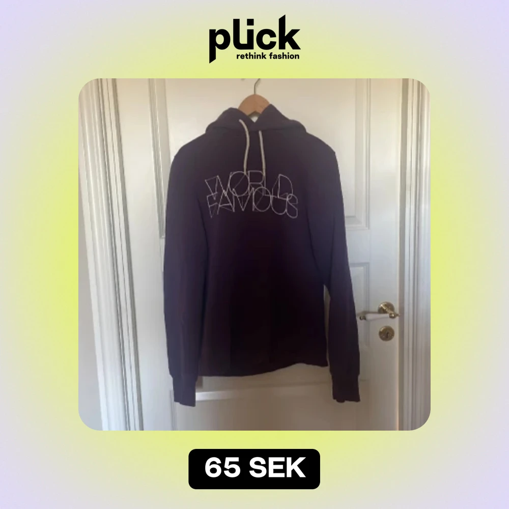 En lila hoodie me tryck där de står ”World Famous” i vitt. Hyfsat använd men ändå i bra skick. Pris går att diskutera!!