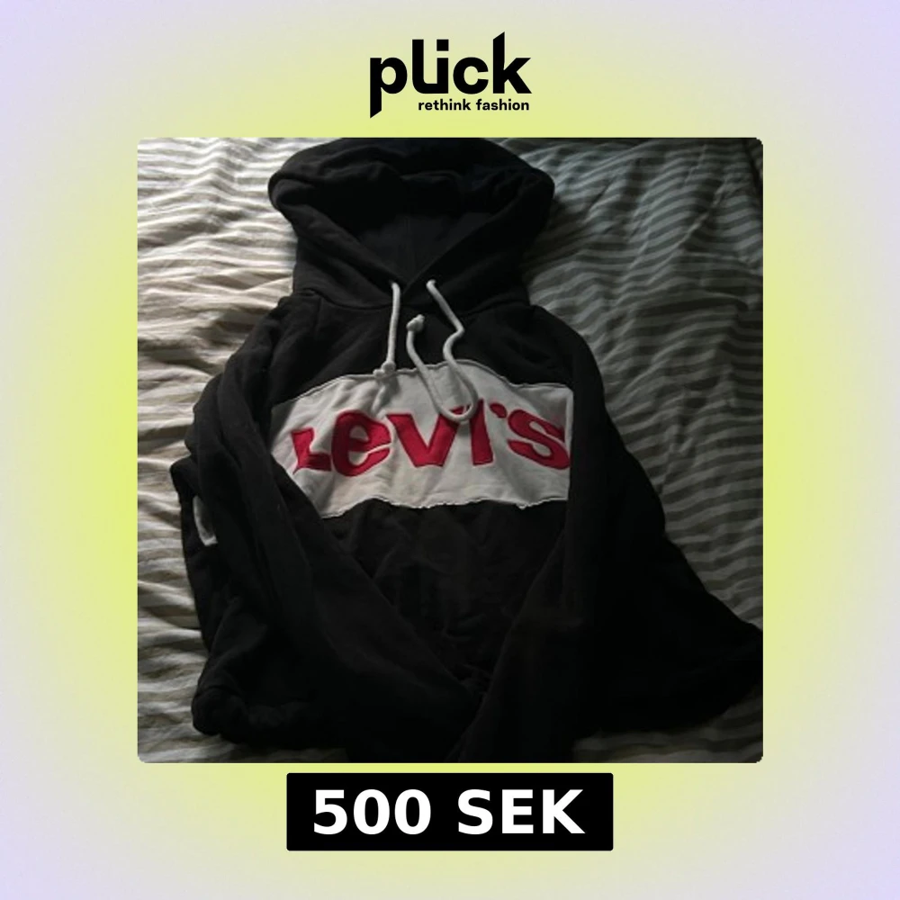 Svart hoodie från Levi's i storlek XS med stor vit och röd broderad logga över bröstet. Tröjan har huva med vita snören och är långärmad. Den är ganska kort så man visar magen men den ska sitta så💕
