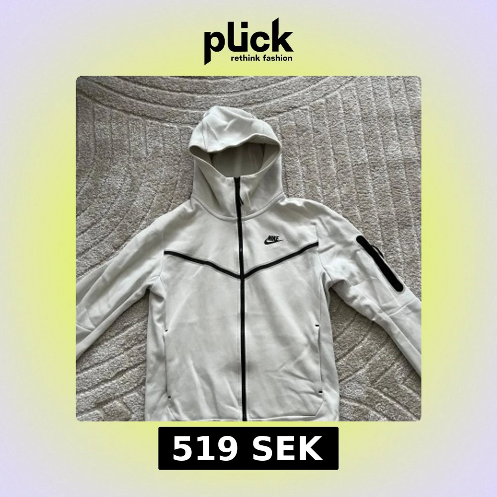 Snygg vit hoodie från Nike tech med dragkedja och huva. Svarta detaljer och logga på bröstet. Praktisk ficka med dragkedja på ärmen. Perfekt för en sportig look.