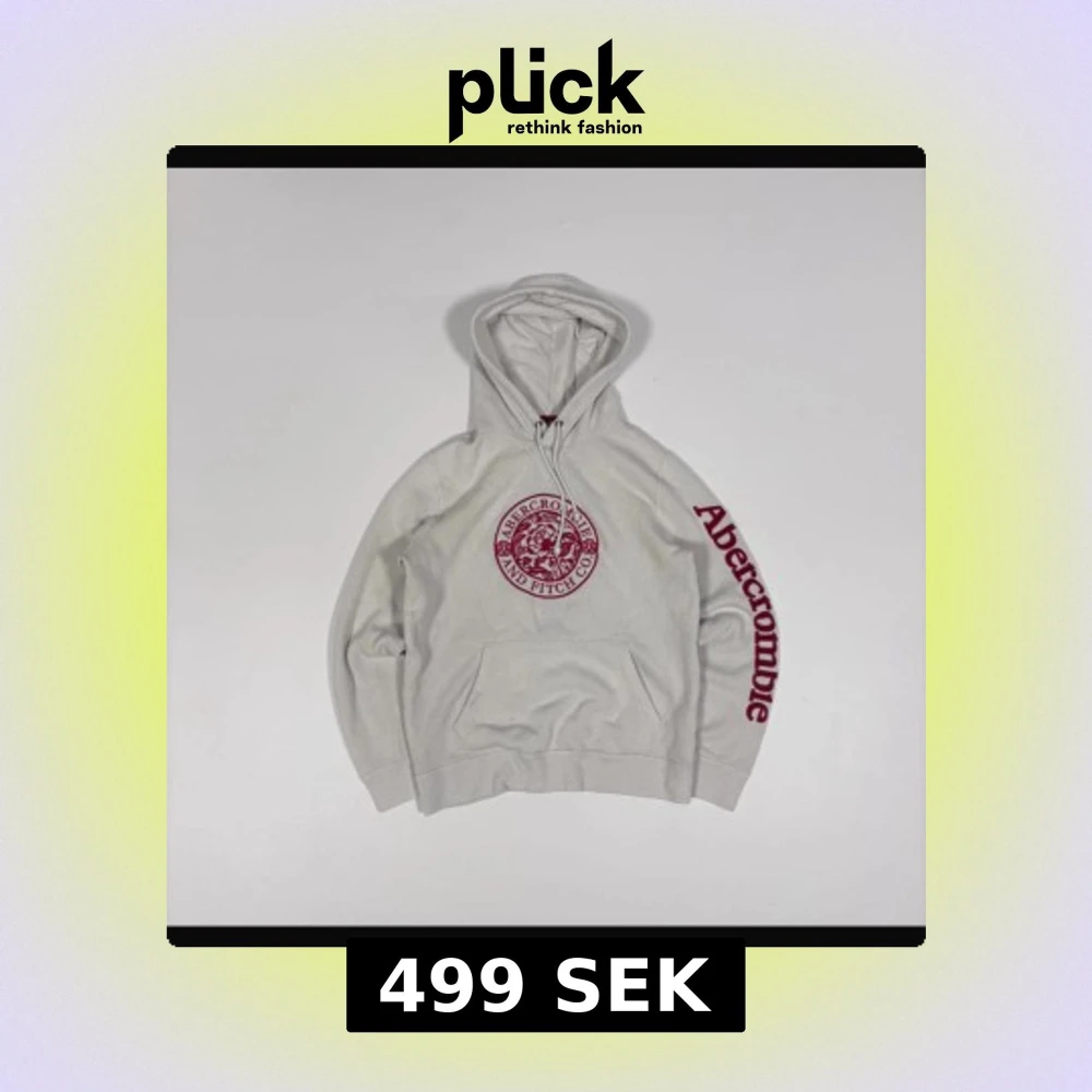 Vit hoodie från Abercrombie & Fitch i storlek S med röd logga på bröstet och stor Abercrombie-text längs ena ärmen. Tröjan har huva med snörning och en klassisk magficka. Perfekt för dig som gillar streetwear och snygga detaljer.