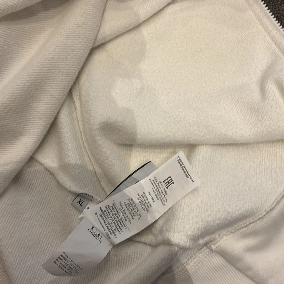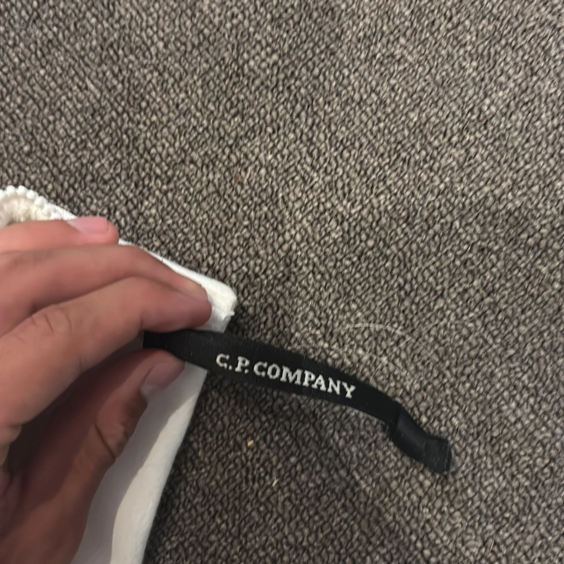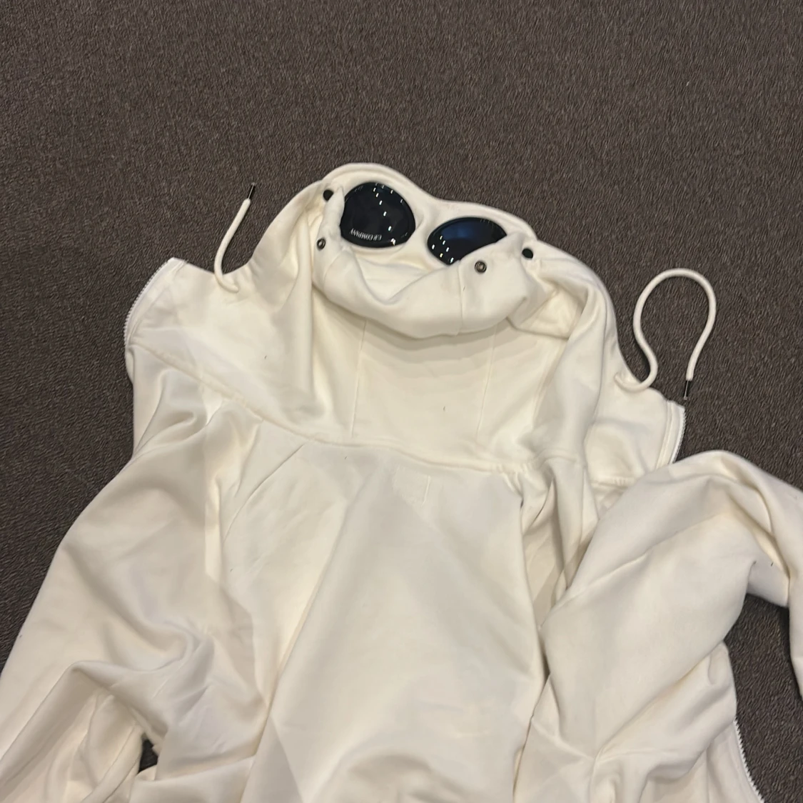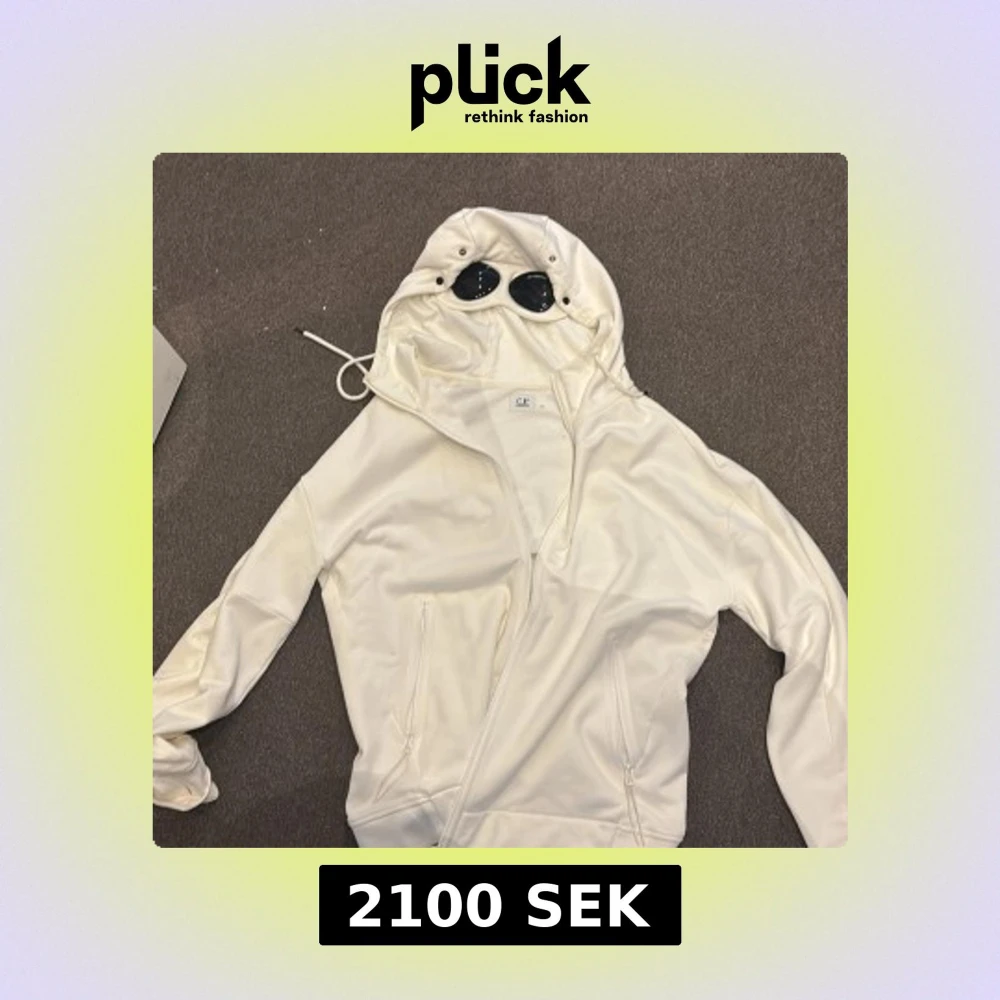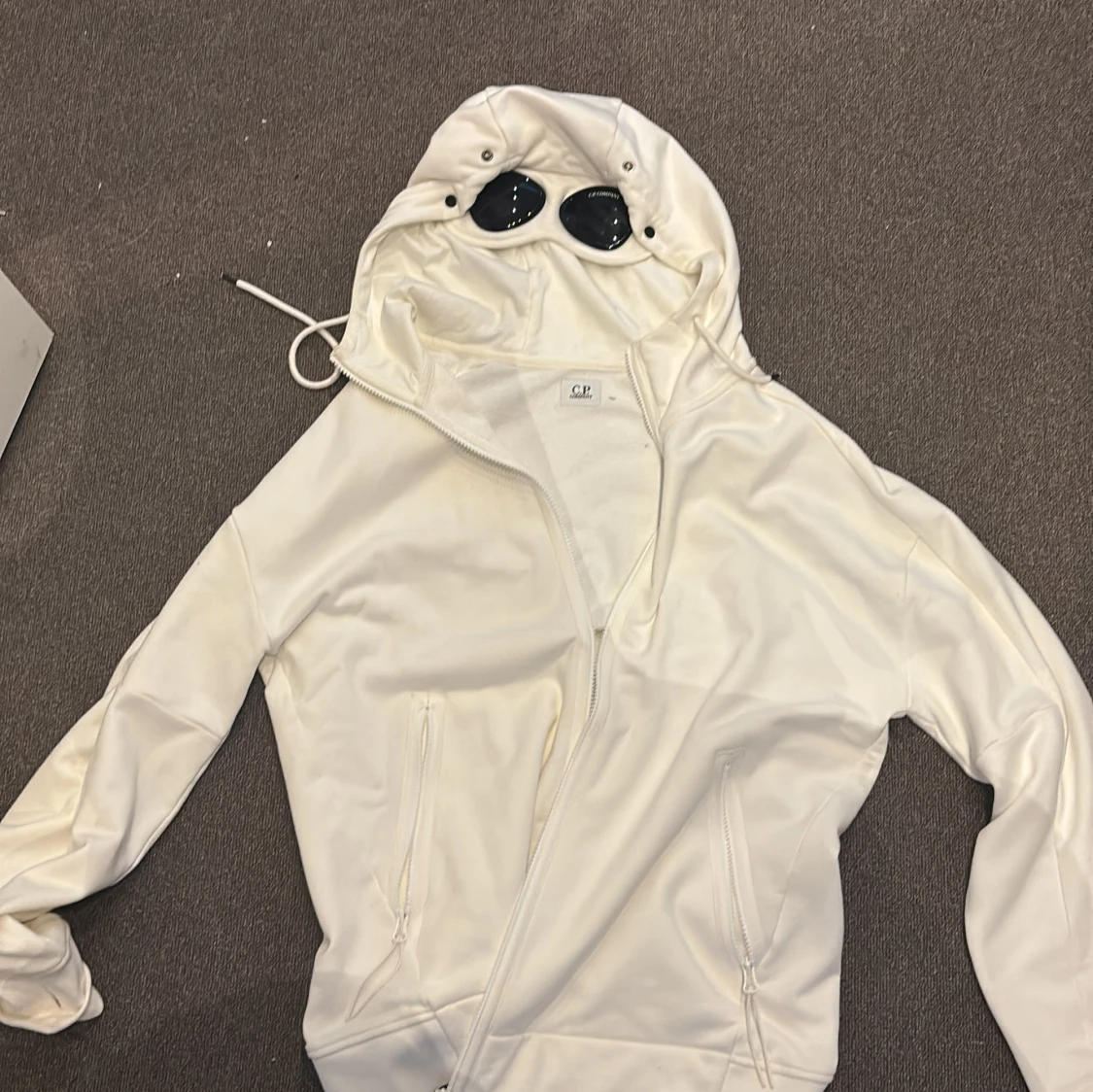 Säljer en vit goggle jacka från C.P. Company i storlek XL. Jackan har huva med ikoniska svarta glasögon, dragkedja framtill och två fickor med dragkedja. Materialet är mjukt och har använt 1 gång så är i otroligt bra skick