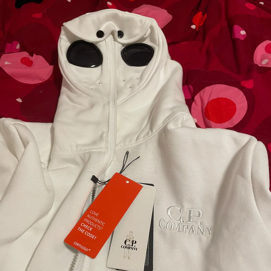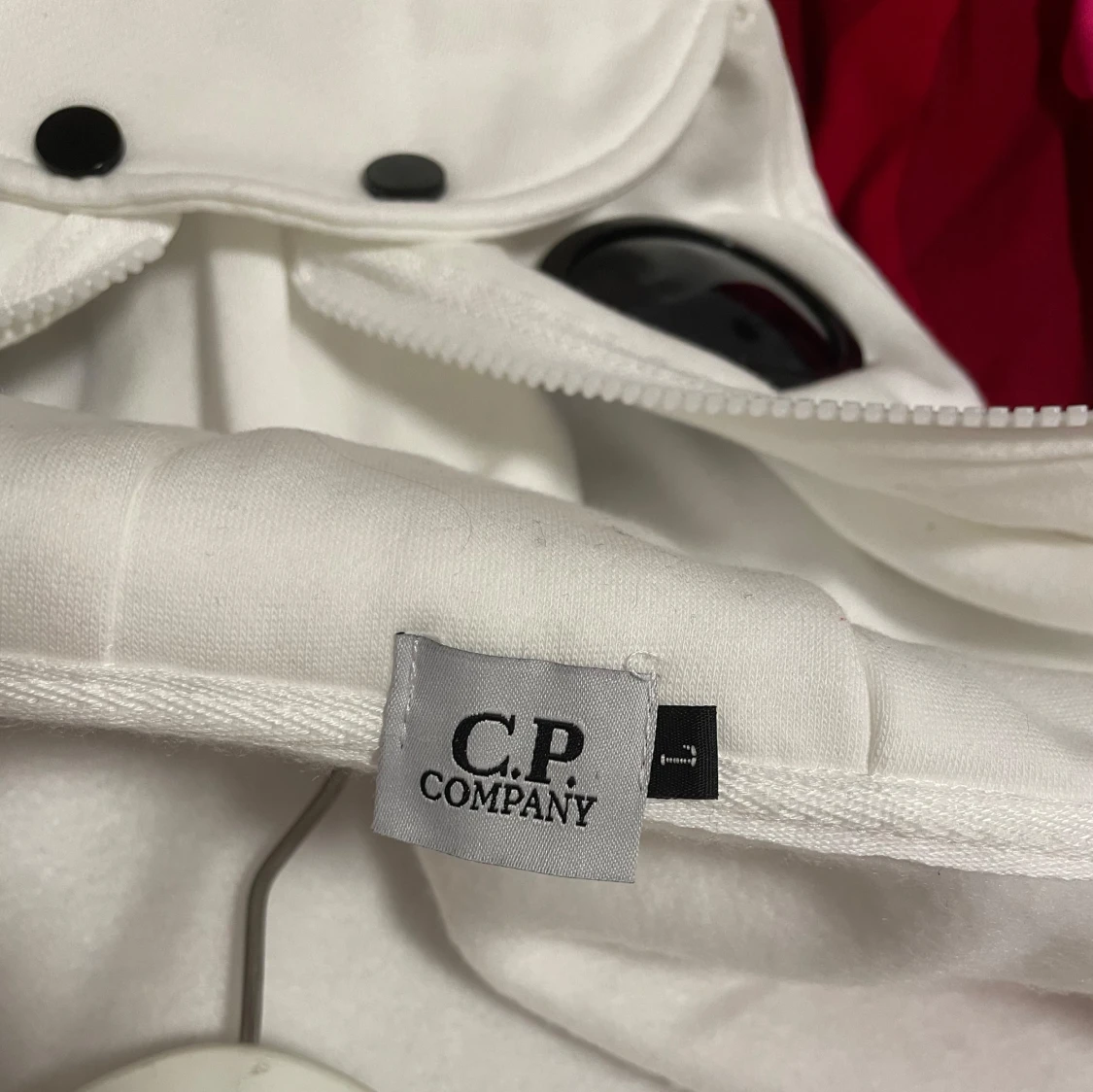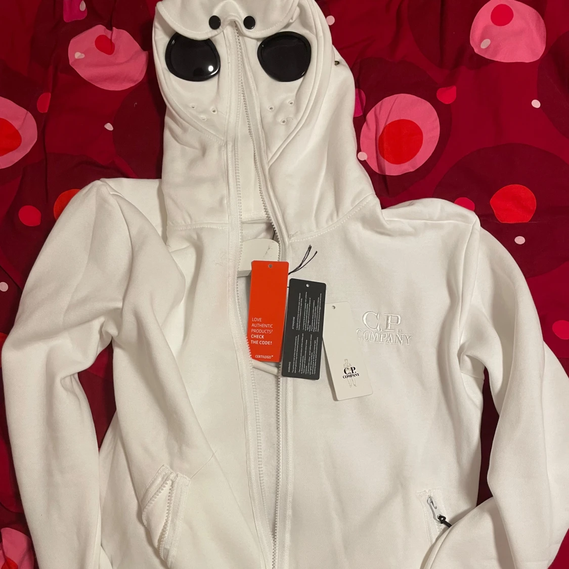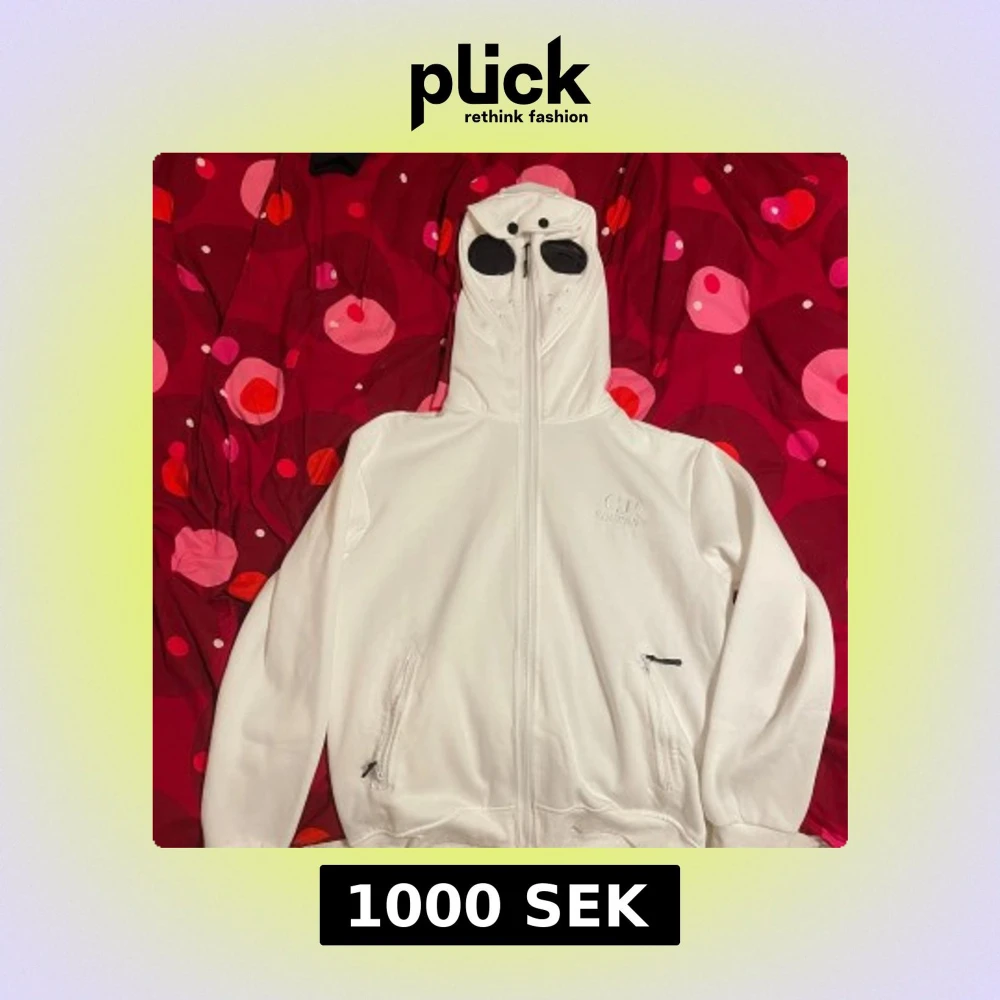 Säljer en vit huvtröja från C.P. Company med unika glasögon i huvan. Tröjan har dragkedja framtill och två fickor med dragkedjor. Perfekt för en stilren och modern look.