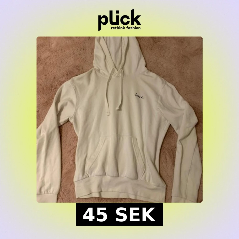 Hoodien är bra använd men det är endast synligt i slutet av ärmarna (se bild 3) går säkert bort vid tvättning av bra medel. Den har i hörnet en liten svart text där det står Love med finstil. Den har även ficka där fram och justerbar storlek på luvan med hjälp av snöret:)