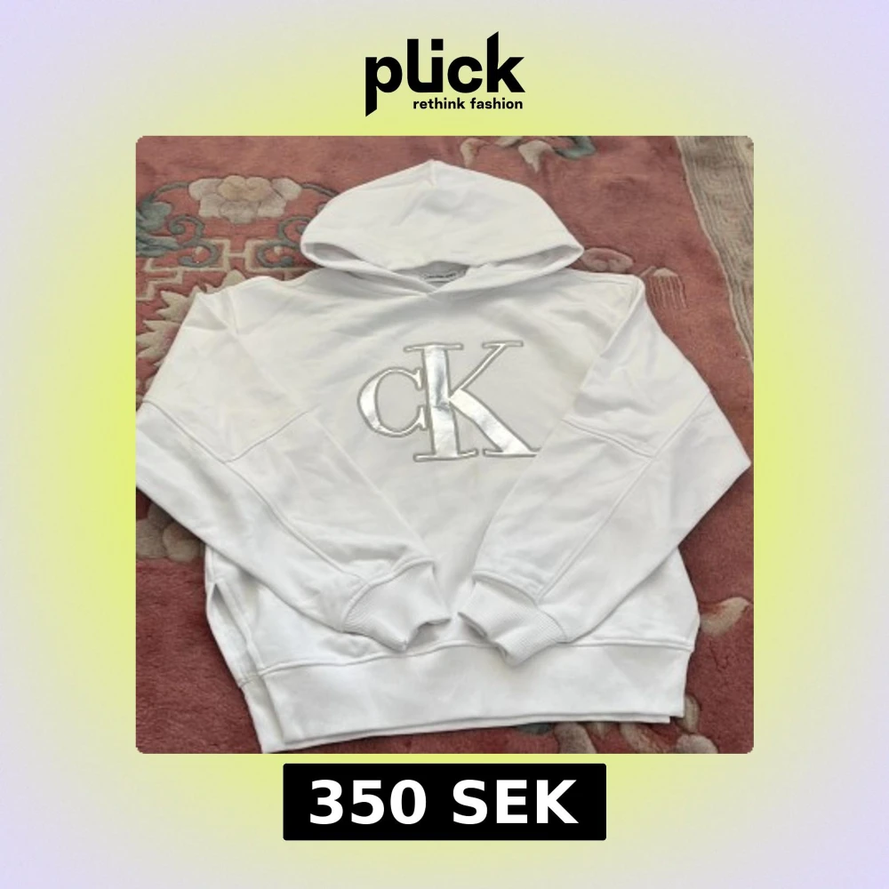 Säljer en vit hoodie från Calvin Klein Jeans med stor CK-logga framtill. Tröjan har huva, långa ärmar och en slits längst ner på varje sida aldrig använd