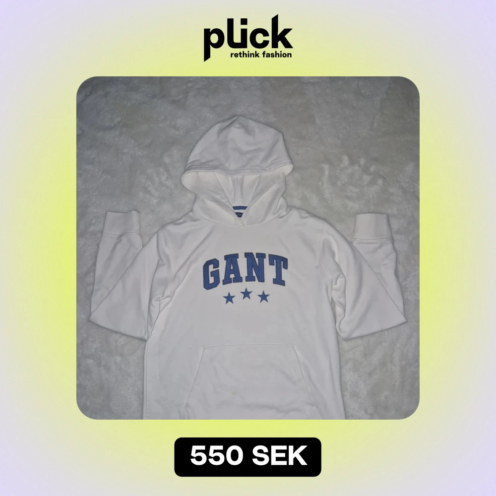Säljer en snygg vit hoodie från GANT med blå text och stjärnor på framsidan. Den är använd 1 gång. Priset är ej hugget I sten. Vid frågor är det bara att ställa! Hoodien passar XS S och 170