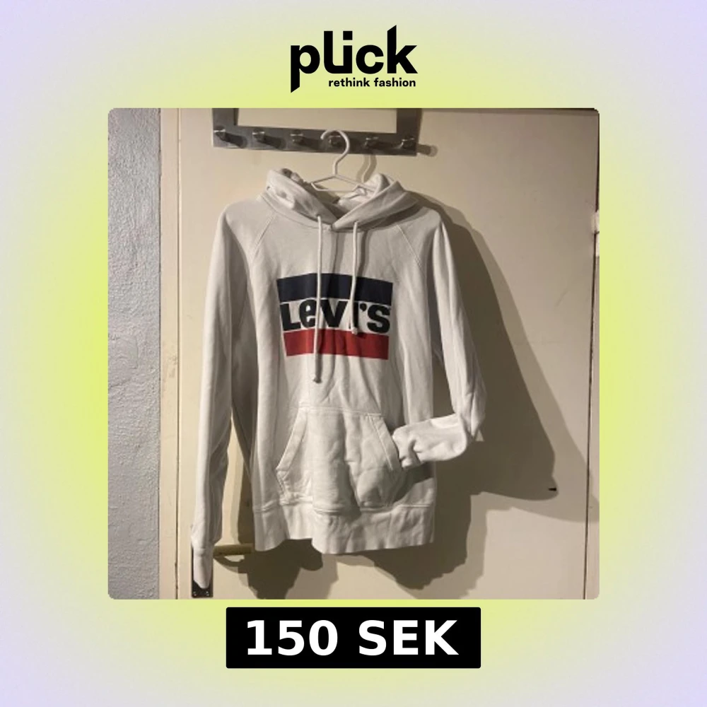 Säljer en klassisk vit hoodie från Levi's med deras ikoniska logga i blått och rött på bröstet.