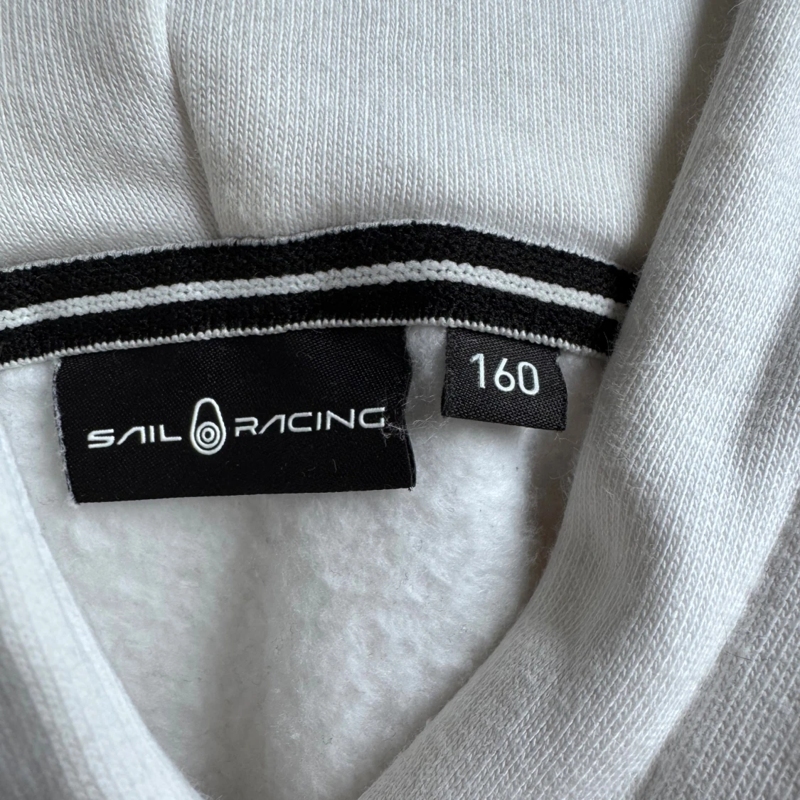 Sail racing JR BOWMAN HOOD. Vit hoodie från Sail Racing med svart logga på bröstet och tryck även på huvan. Strl 160 Klassisk känguruficka framtill och mjuk insida. Perfekt för dig som gillar en clean och sportig stil. Något nopprig insida men inga andra synliga tecken på användning