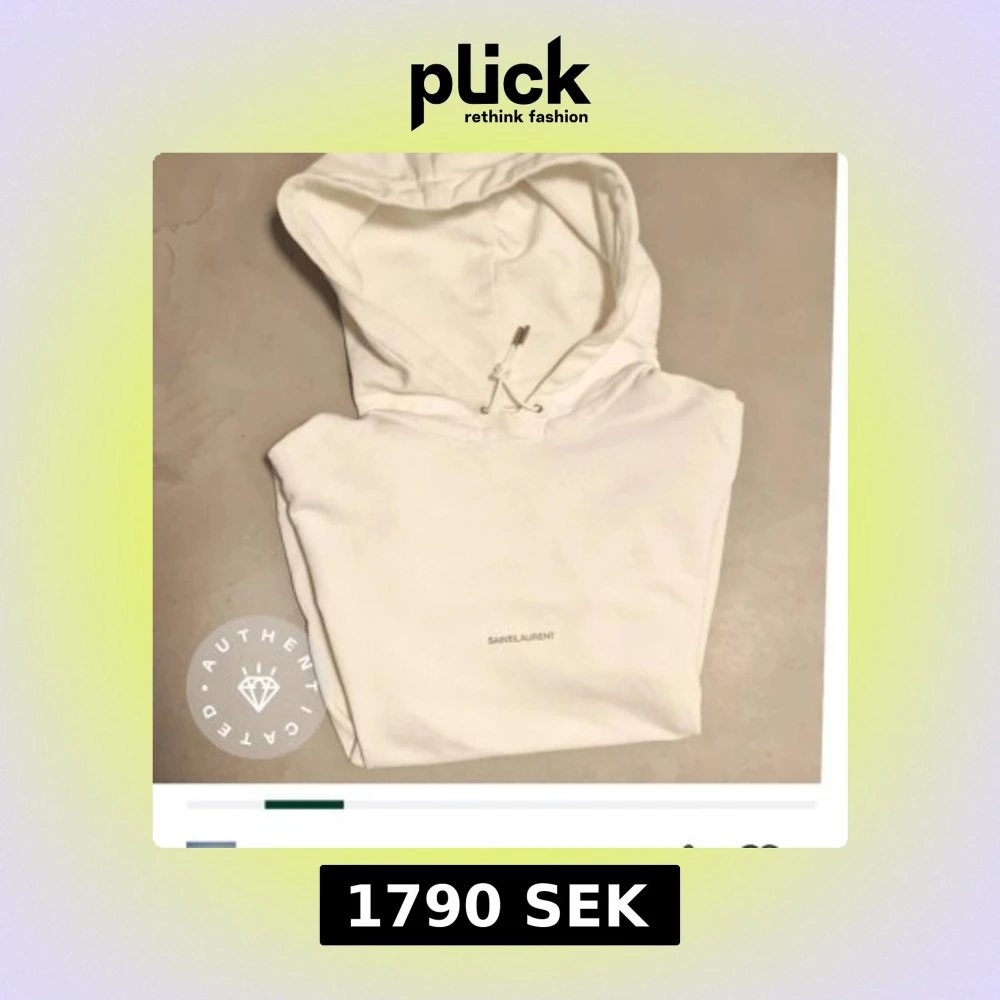 Supersnygg vit huvtröja med diskret logotyp framtill. Modell Rive Gauche. Inte gulnad, märken eller fläckar. Äkthetsintygad på Tradera. Skick 9/10. Längd ca 70 cm, bredd under arm ca 57 cm. Nypris dryga 8000 kr.