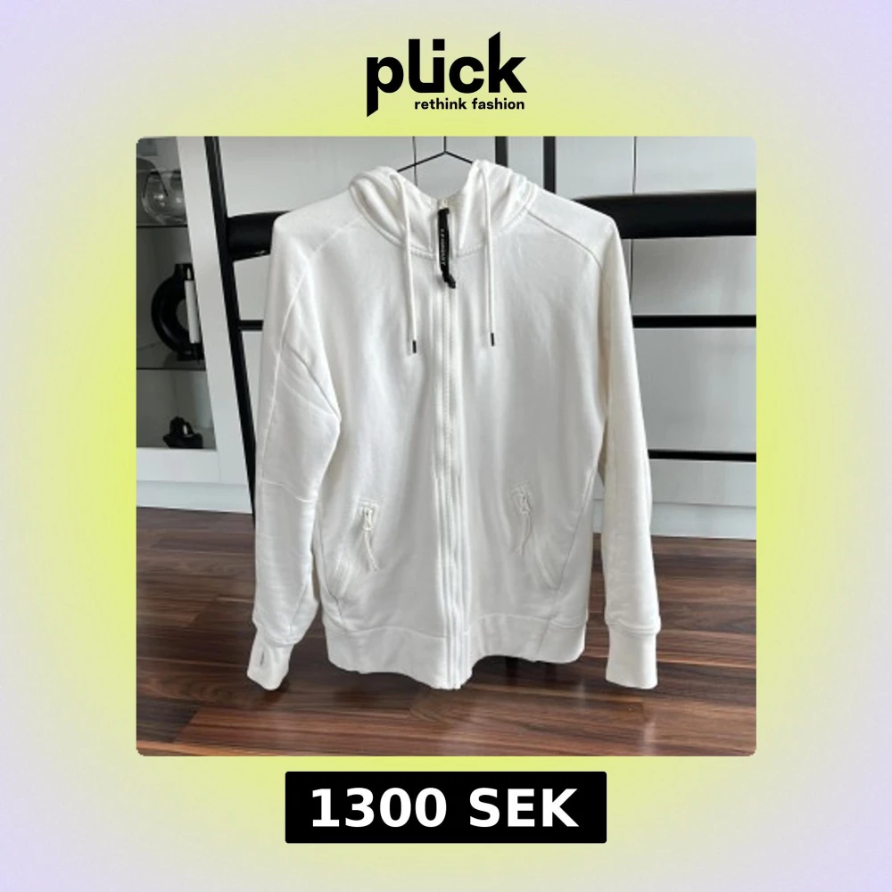 Säljer en clean vit hoodie från C.P. Company med dragkedja, huva med ikoniska goggles och två fickor med dragkedja. Säljer på grund av att storleken inte passar längre. Tröjan är i storlek S Perfekt för dig som vill sticka ut med streetwear-vibe.