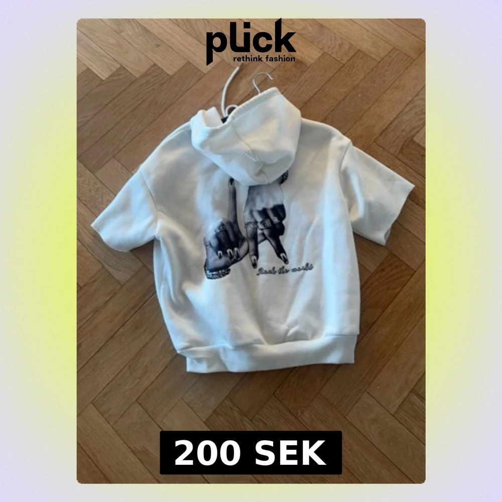 Säljer en vit hoodie med korta ärmar och huva med dragsko. På ryggen finns ett svartvitt tryck av två händer med smycken och texten 'Fuck the world'. Hoodien har en avslappnad passform och ribbade muddar nedtill. Perfekt för en streetwear-look.