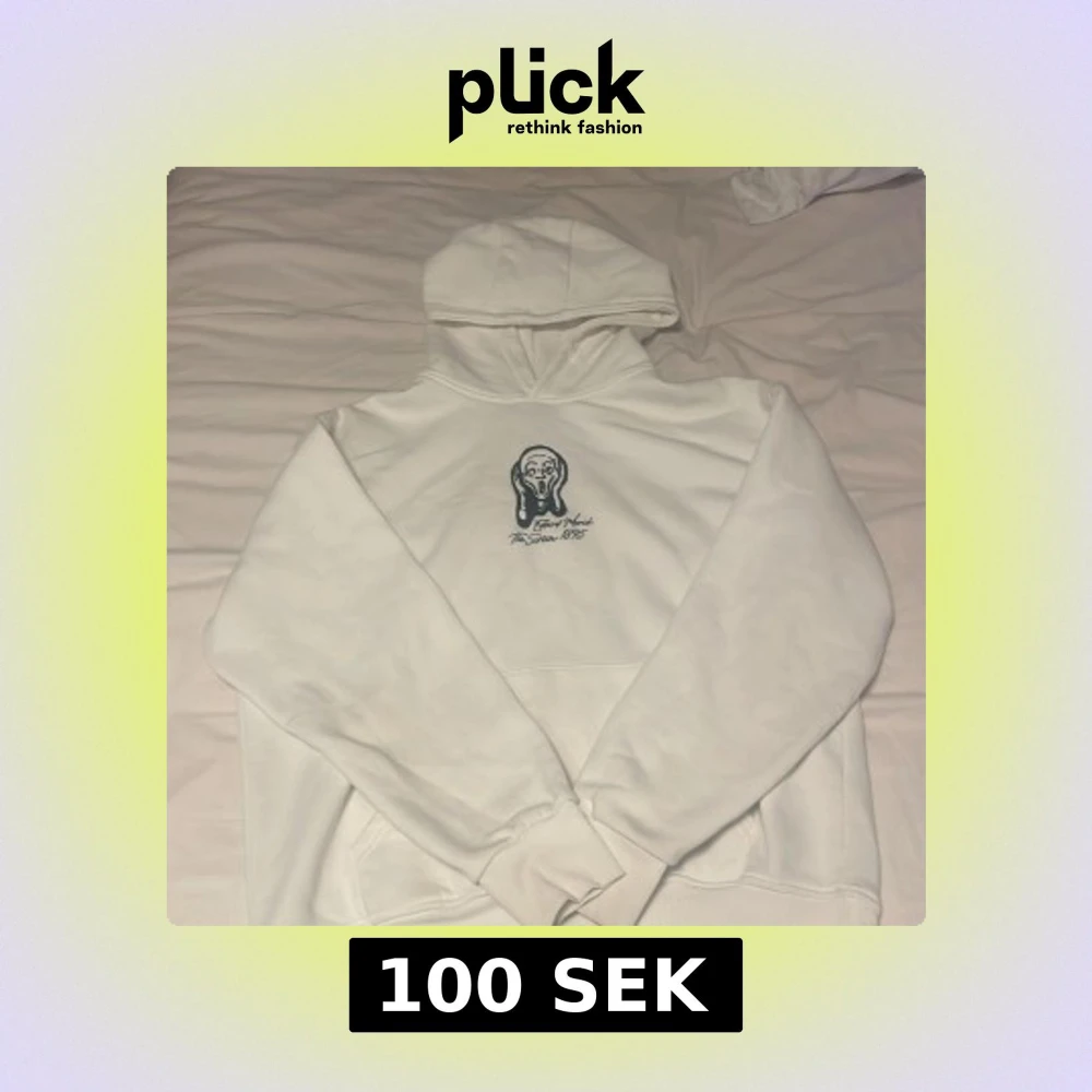 Vit hoodie från Primark i storlek M med stor svartvit print av Edvard Munchs 'Skriet' både fram och bak. Tröjan har huva, lång ärm och en klassisk känguruficka framtill. Mjuk insida och ribbade muddar vid ärmslut och nederkant. Perfekt för dig som gillar konst och streetstyle.