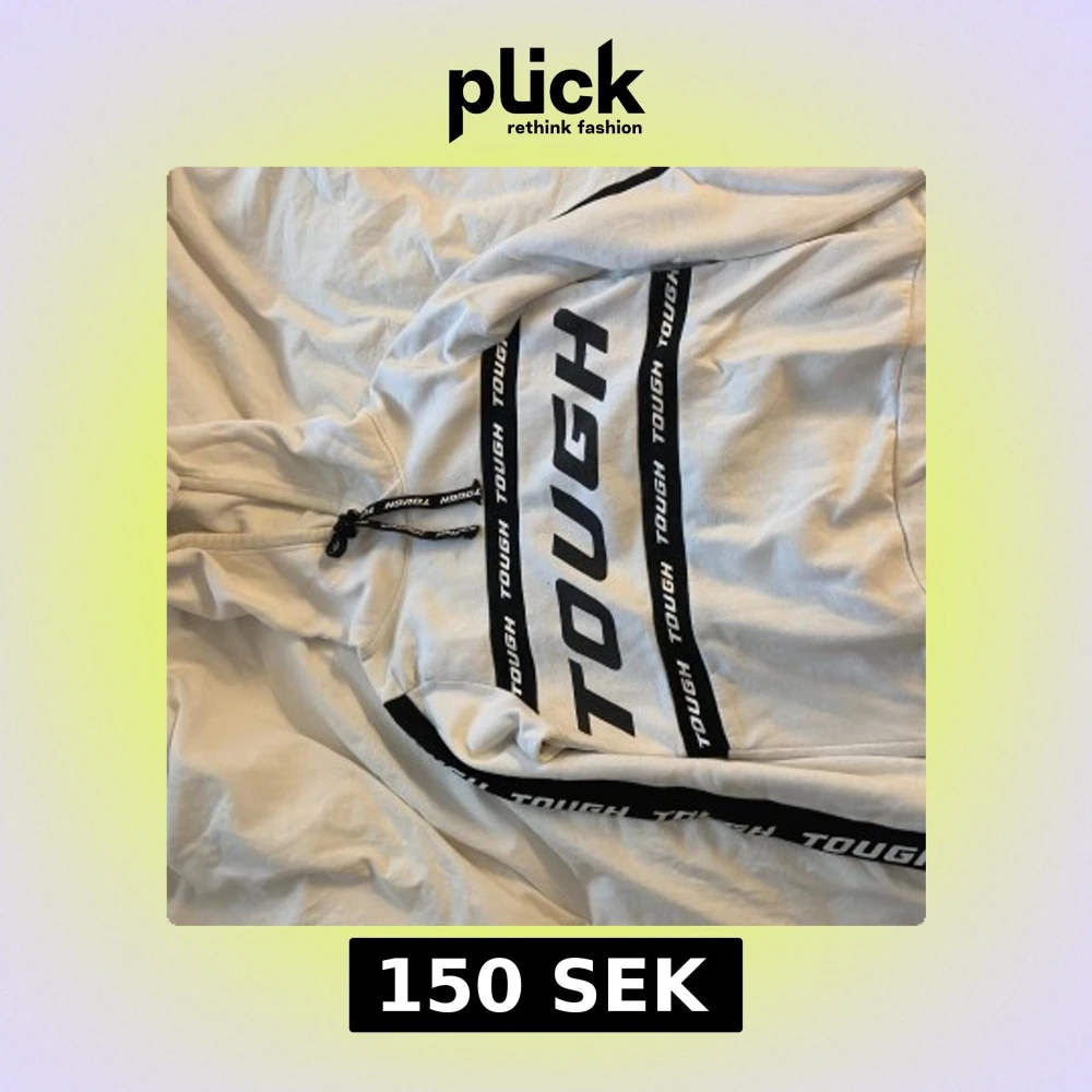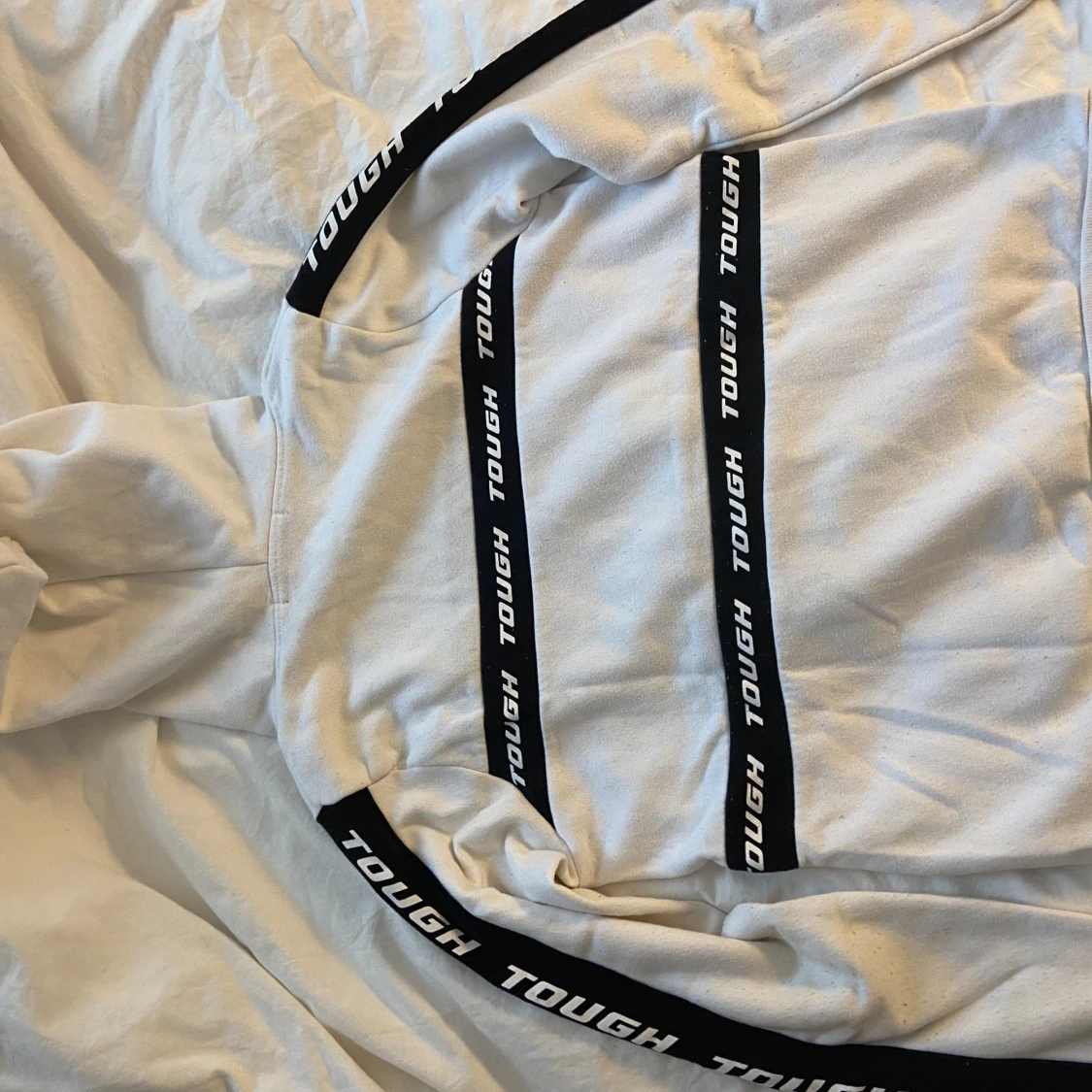 Säljer denna vita hoodien med texten TOUGH