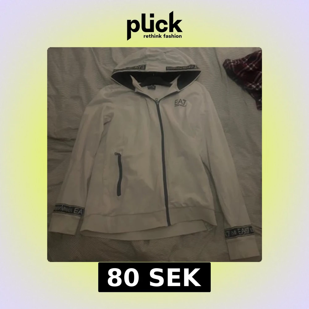 Vit hoodiejacka med svarta detaljer och dragkedja från Emporio Armani EA7. Jackan har huva, muddar med logotyp och en ficka med dragkedja på ena sidan. Perfekt för en sportig och avslappnad stil.