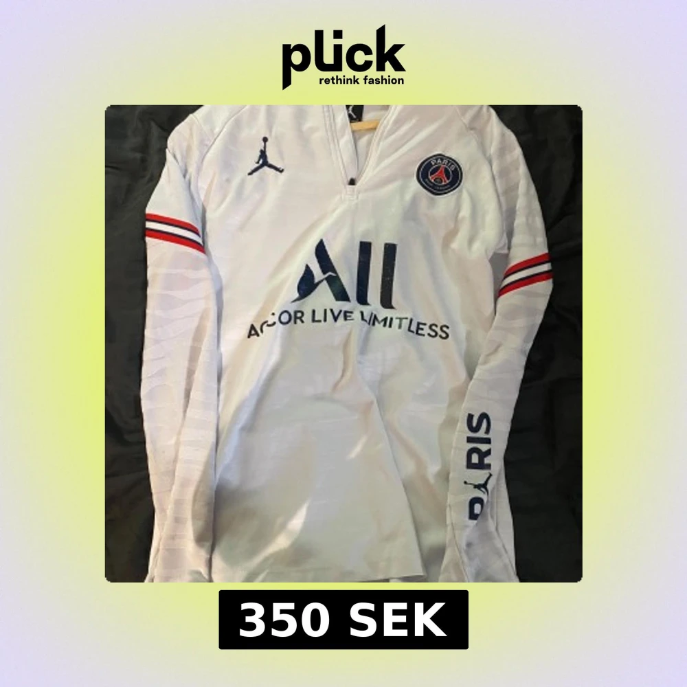 Vit långärmad PSG fotbollströja från Jordan med klubbmärke på bröstet, mörkblå loggor och text, samt röda och blå ränder på ärmarna. Tillverkad i lätt och ventilerande material, perfekt för träning eller match. Snygg detalj med 'PARIS' på ärmen och 'VISIT RWANDA' på ryggen.
