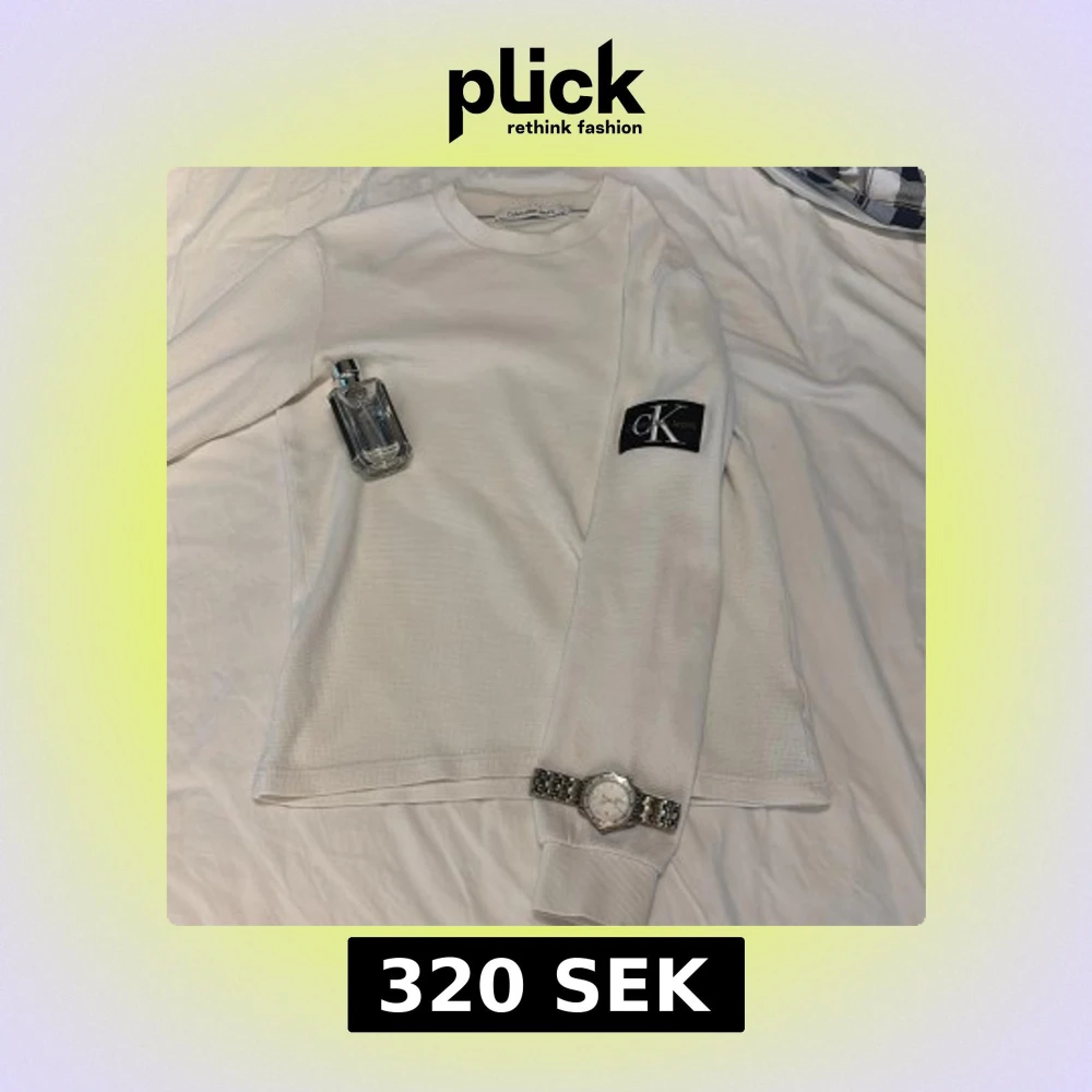 lite fläkig därför pris, Vit långärmad tröja från Calvin Klein Jeans med svart patch och CK-logga på ena ärmen. Tröjan är i ett strukturerat bomullstyg och har en klassisk rund halsringning. Perfekt för en clean och stilren look.