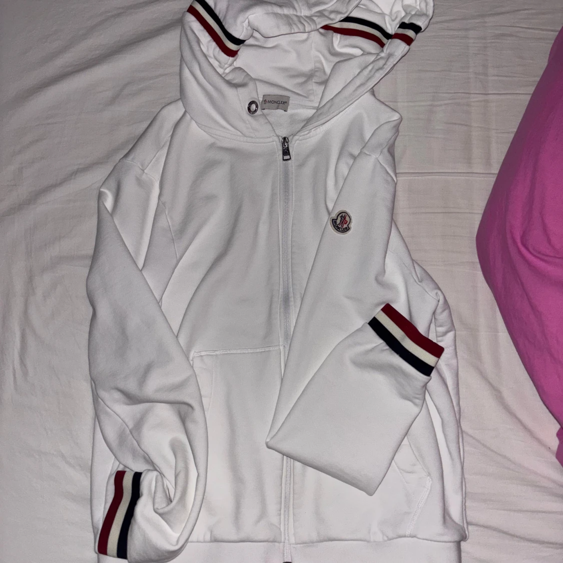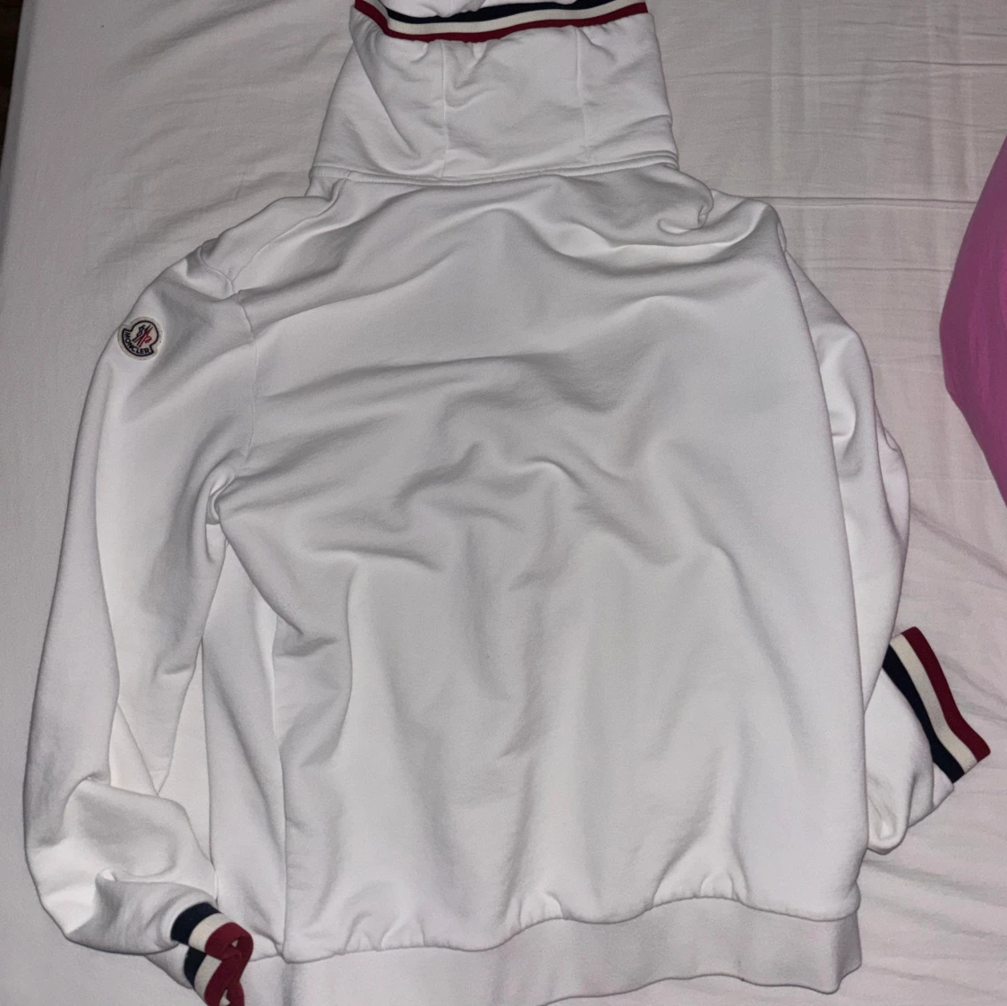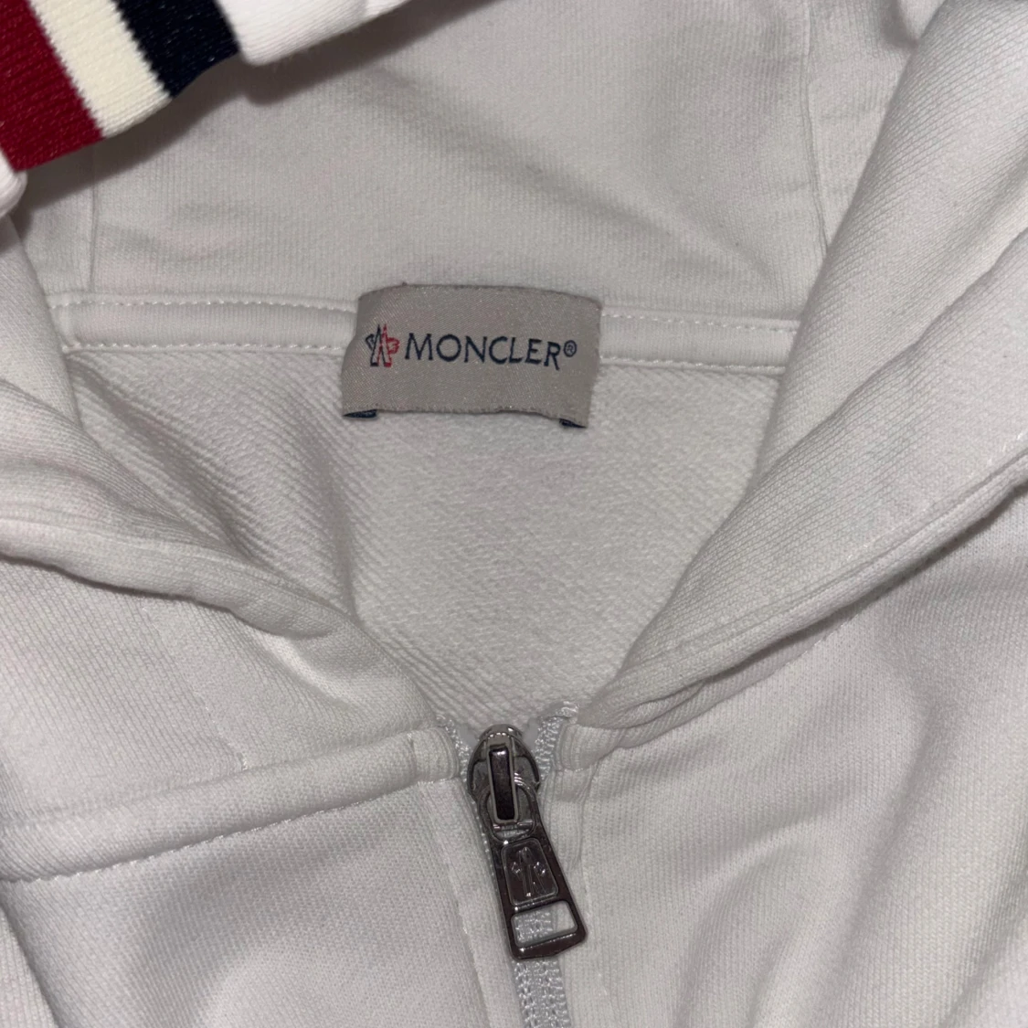 Vit hoodie från Moncler med dragkedja framtill och huva. Ribbade muddar och huva med röd, blå och vit randig detalj. Bild på QR-kod kan skickas vid intresse, snörena från hoodien ingår, kan skickas bild på dom också , storlek XL nypris ca 5000kr