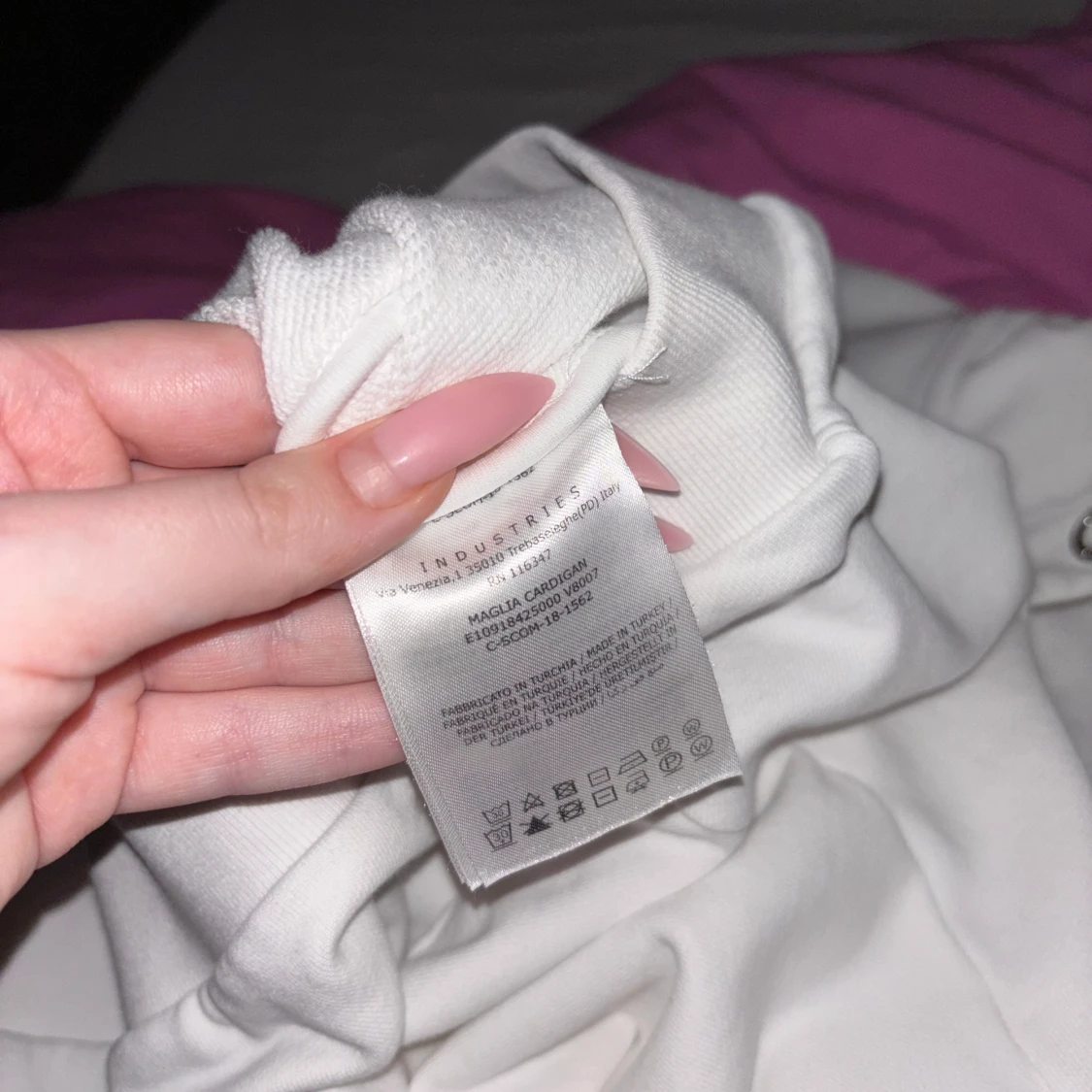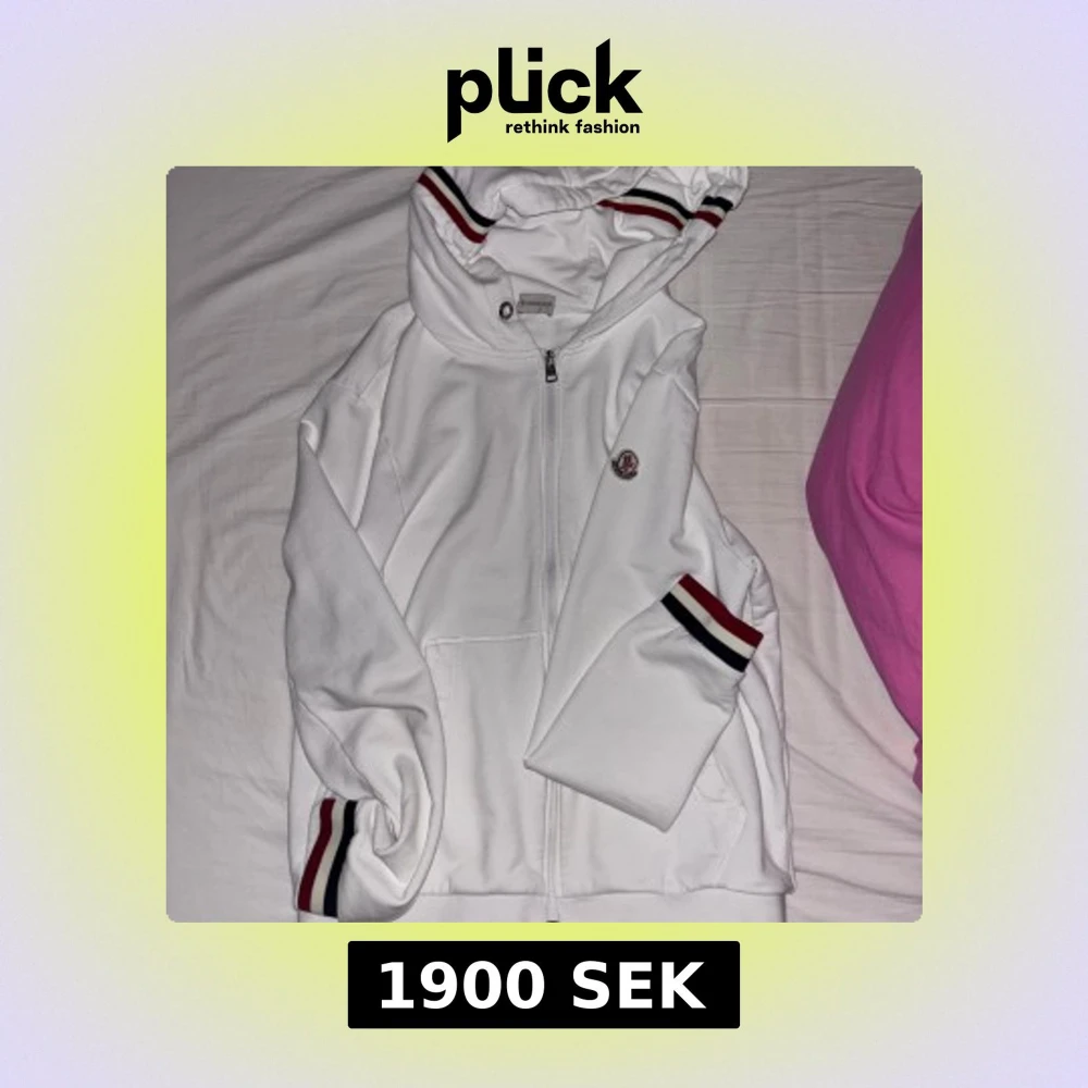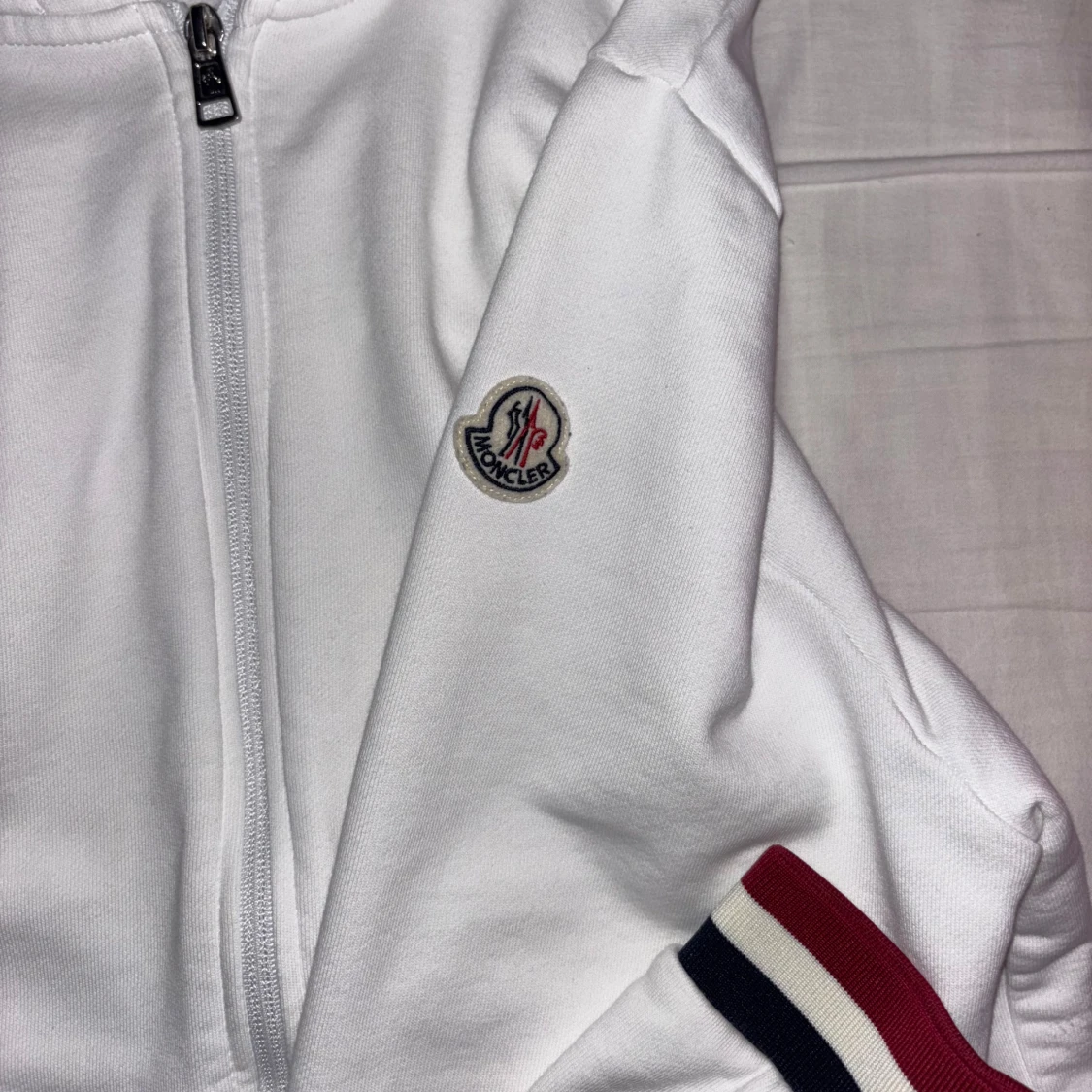 Vit hoodie från Moncler med dragkedja framtill och huva. Ribbade muddar och huva med röd, blå och vit randig detalj. Bild på QR-kod kan skickas vid intresse, snörena från hoodien ingår, kan skickas bild på dom också , storlek XL nypris ca 5000kr