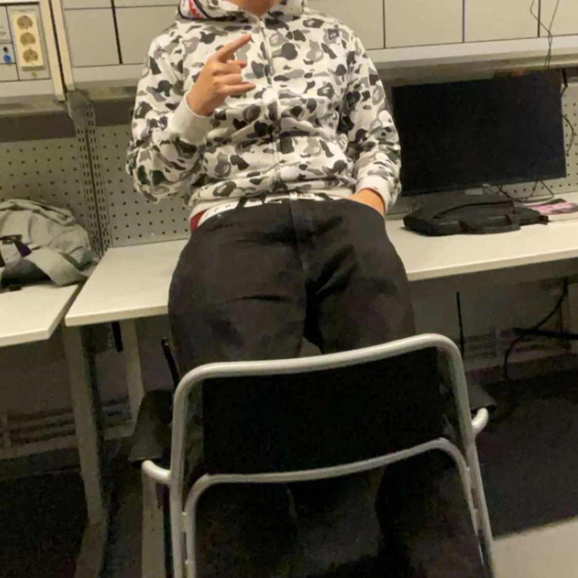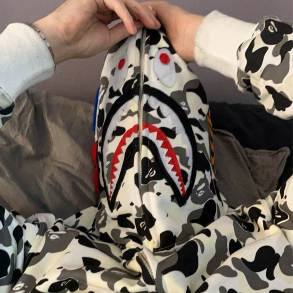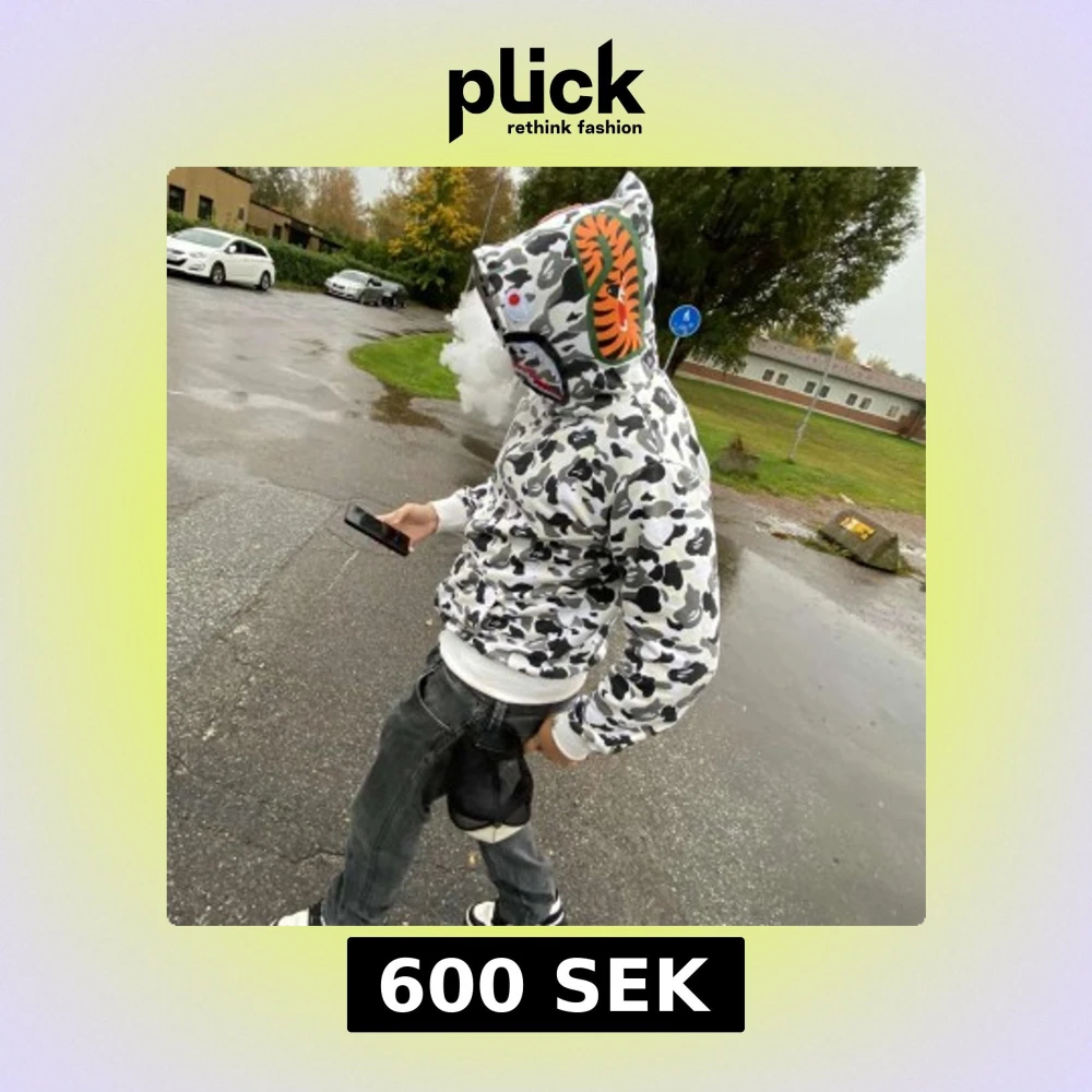 Säljer en hoodie från BAPE i vit och svart camo.. Dragkedja hela vägen upp och broderade detaljer i färg. Perfekt för dig som vill sticka ut med streetwear-stil. Lyser även i mörkret