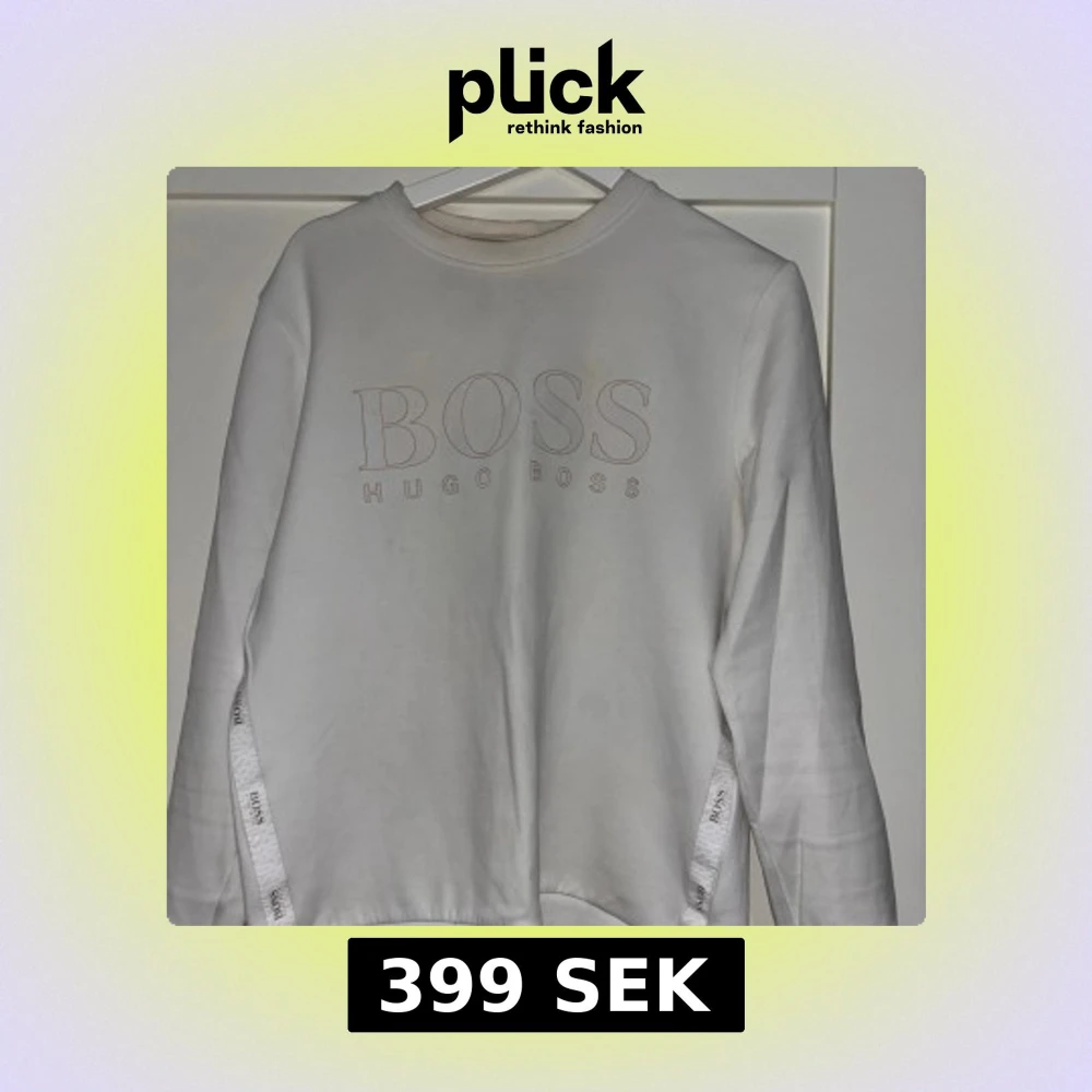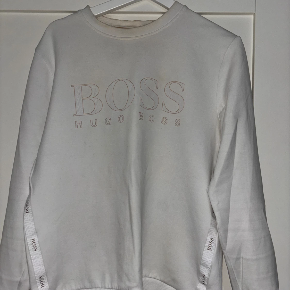 Säljer en stilren vit sweatshirt från Hugo Boss med logga framtill och dekorativa band med BOSS-tryck längs sidorna. Tröjan har rund halsringning och långa ärmar, perfekt för en clean och trendig look.