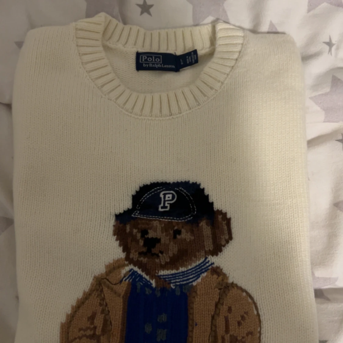Säljer en vit tröja från Polo Ralph Lauren med ett coolt björnmotiv på framsidan. Tröjan har långa ärmar och ribbstickade muddar vid ärmslut och nederkant. Perfekt för en avslappnad stil!