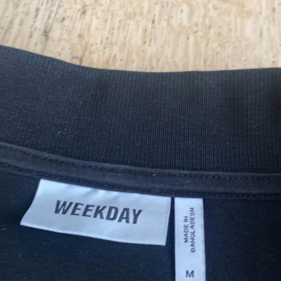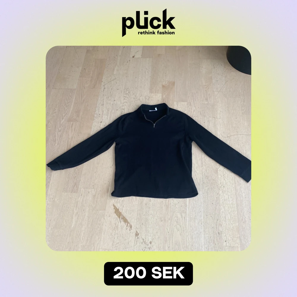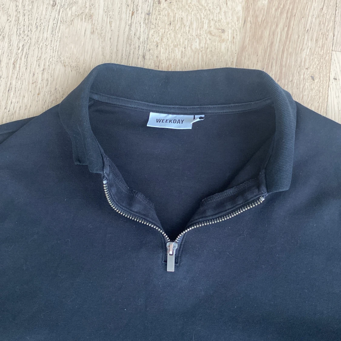 Säljer en stilren svart tröja från Weekday i storlek M. Tröjan har en praktisk dragkedja vid halsen och långa ärmar. Perfekt för både vardag och lite kyligare dagar. Passar till det mesta i garderoben!