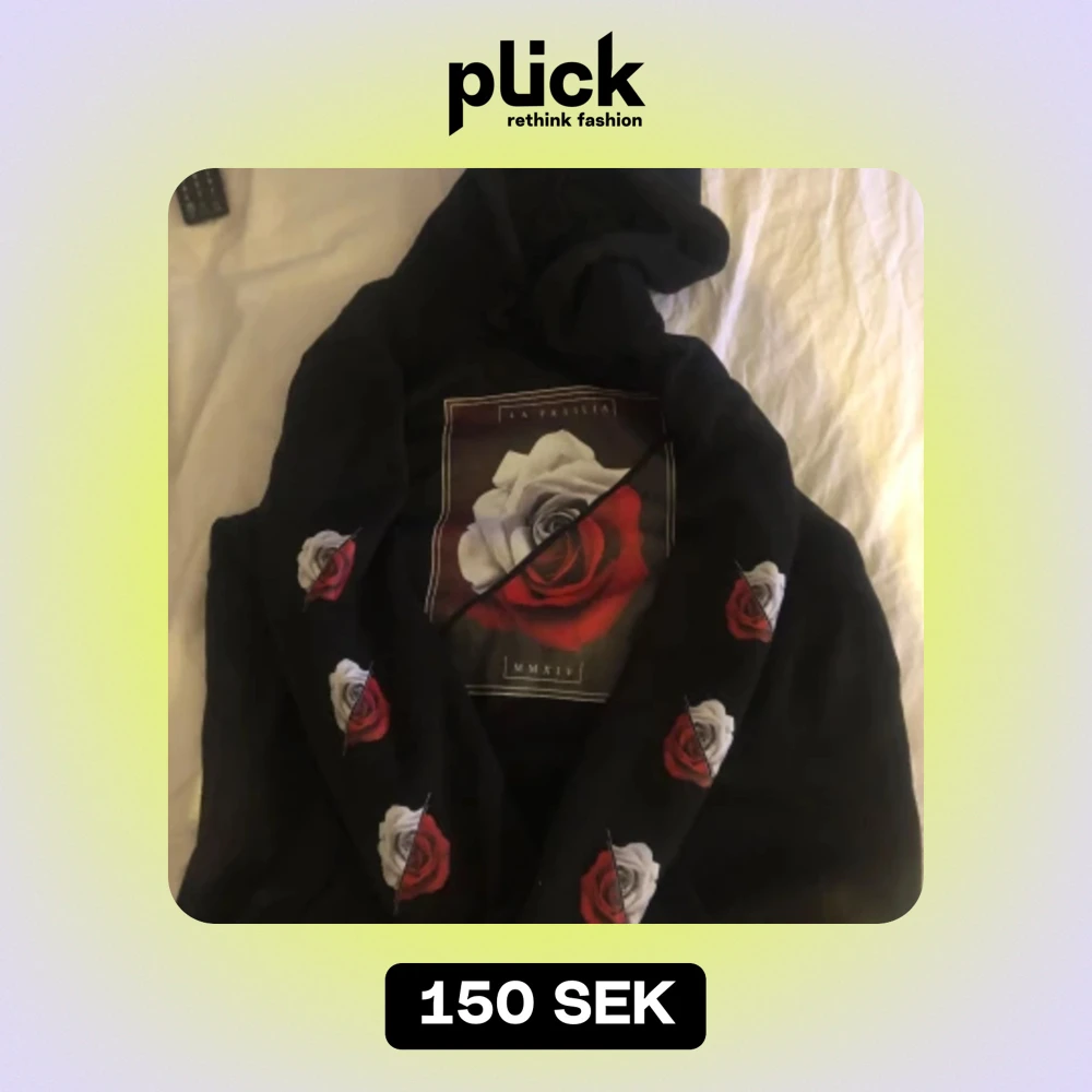 En svart hoodie med rosor som tryck både på armarna och bröstet. Storlek XL väldigt skönt material. Inte så andvänd och i bra skick. Köparen står för frakten.