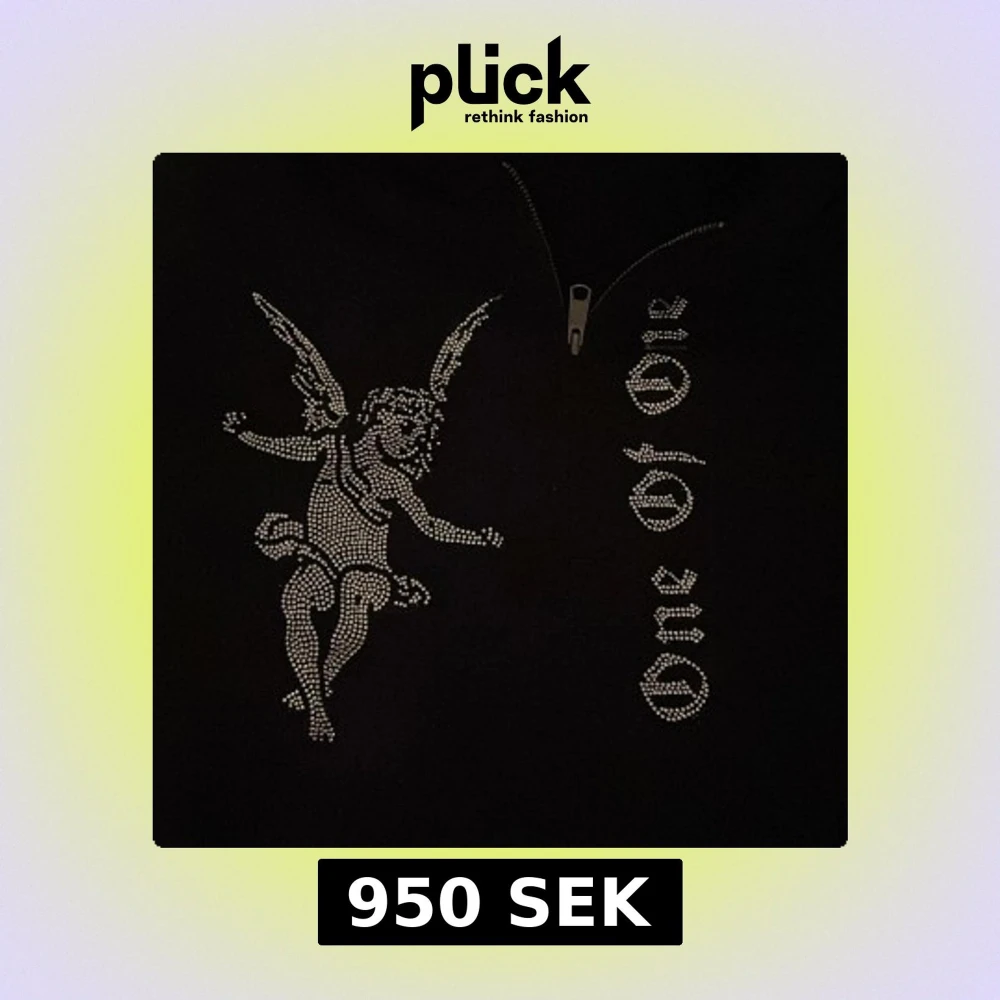 Säljer en svart hoodie från One of One med ett ängelmotiv i stenar på framsidan. Hoodien har en dragkedja och texten 'One of One' i samma stil. Hoodie har aldrig använts och är som ny. Den är i storleken XL och har en bra passform.