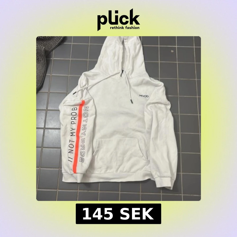 Säljer en vit over sized hoodie från FB Sister med texten 'MOOD' på bröstet och 'NOT MY PROB' längs ärmen. Hoodien har en orange rand som detalj och en klassisk känguruficka framtill. Perfekt för en avslappnad stil.